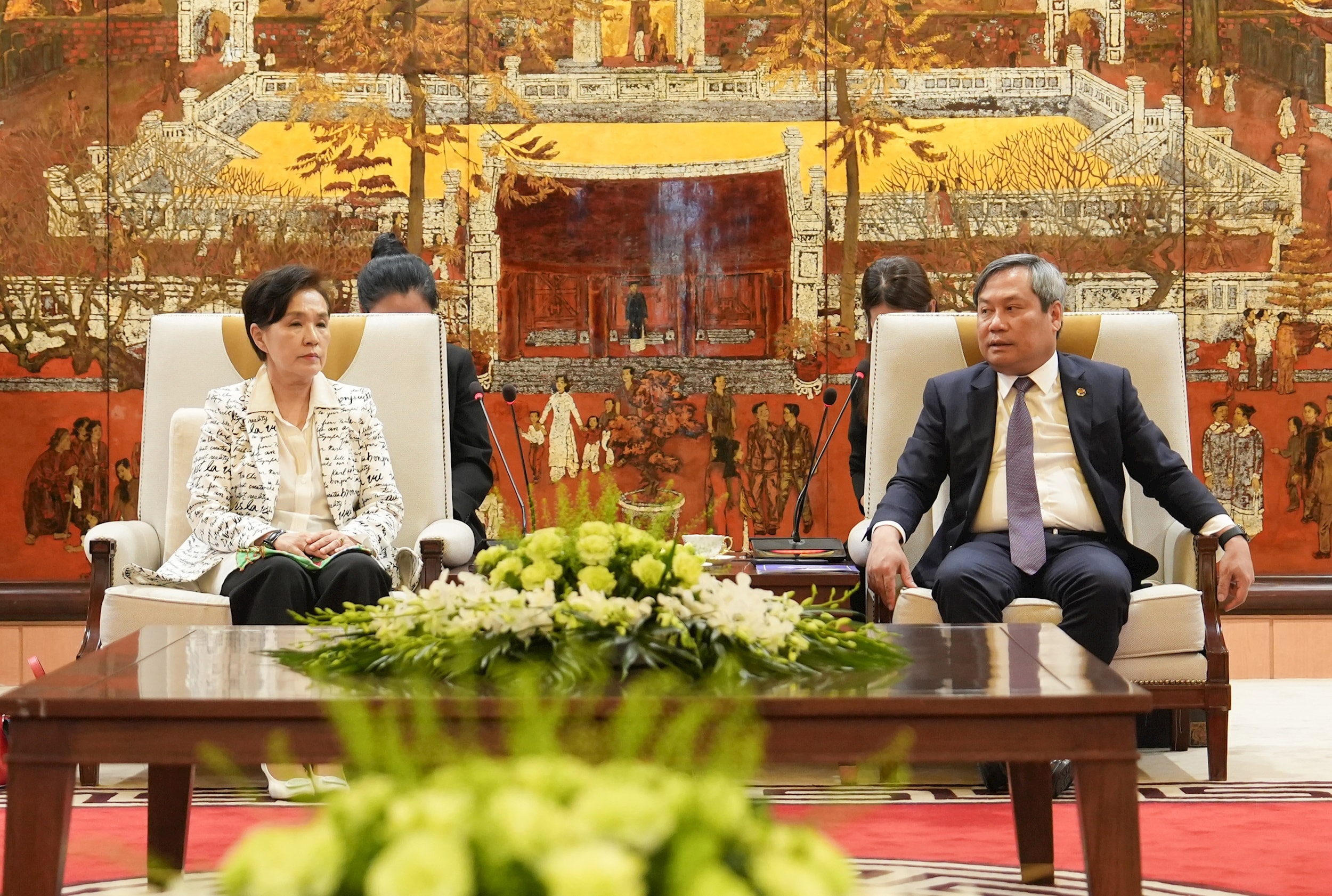 Chủ tịch UBND thành phố Vũ Đại Thắng (phải) trao đổi với bà Kang Kum Sil, Đại sứ Khí hậu và Môi trường toàn cầu Hàn Quốc. Ảnh: Hoàng Linh