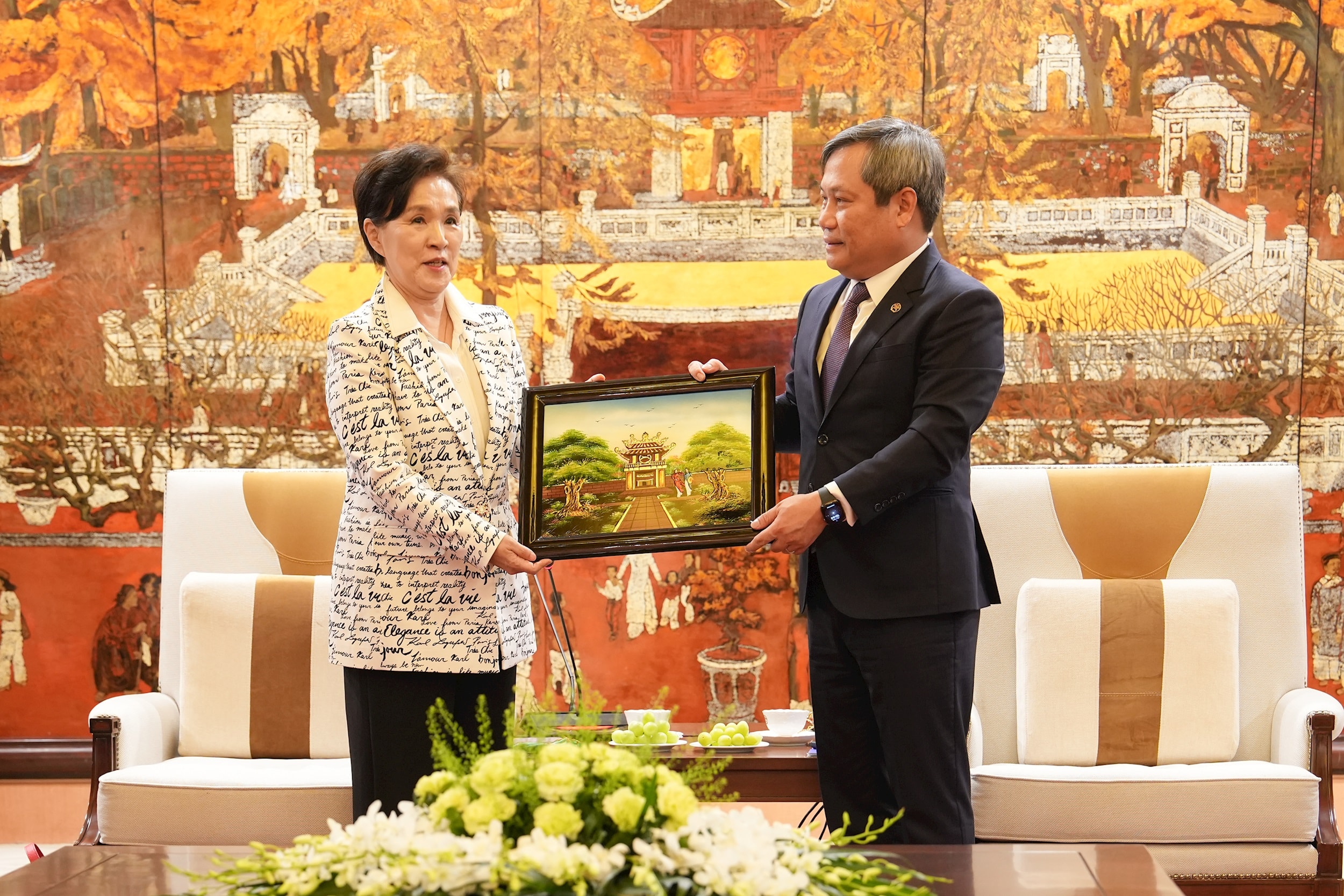 Chủ tịch UBND thành phố Vũ Đại Thắng trao quà lưu niệm của Thủ đô Hà Nội cho bà Kang Kum Sil. Ảnh: Hoàng Linh