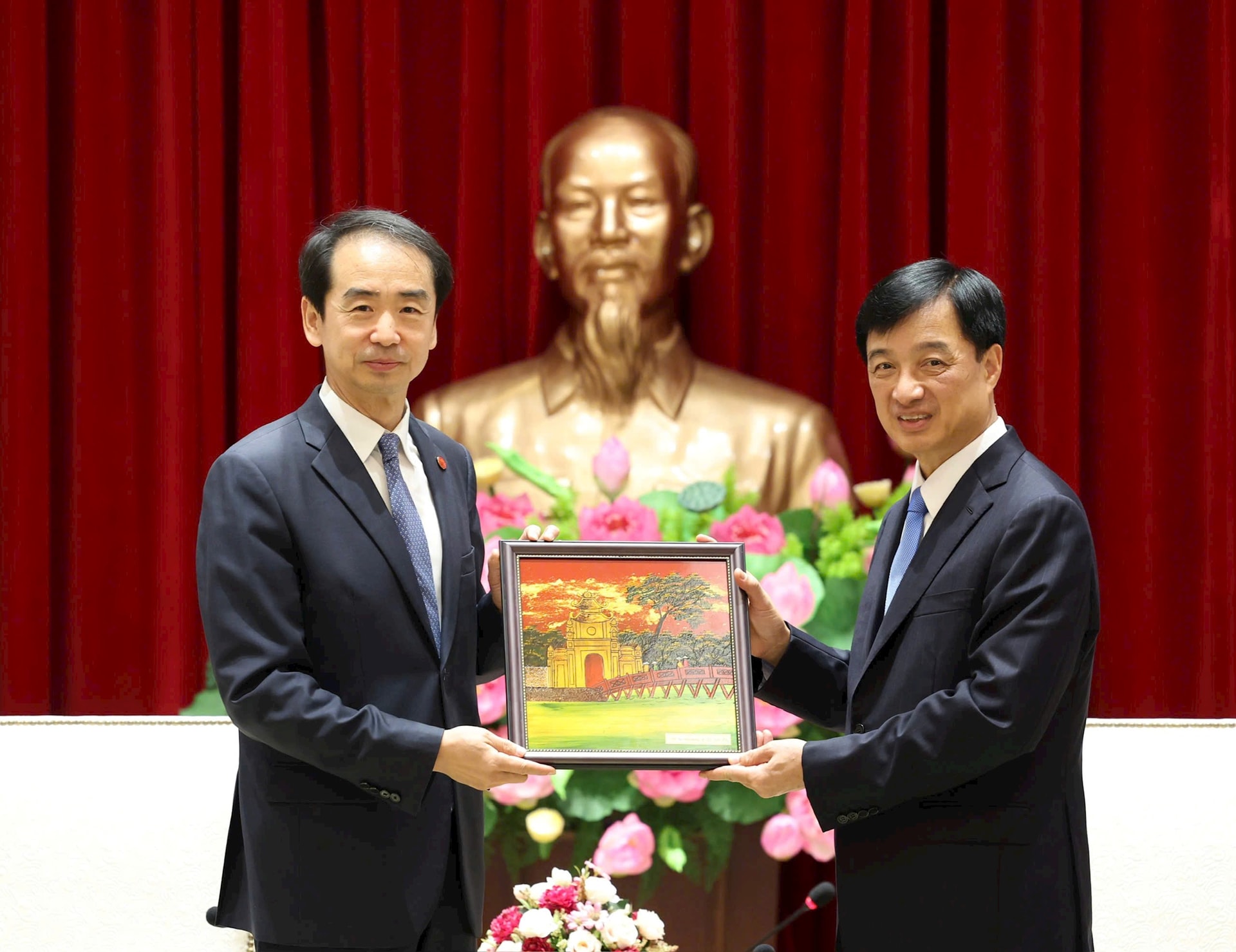 Bí thư Thành ủy Nguyễn Duy Ngọc trao quà lưu niệm của Thủ đô Hà Nội cho Đại sứ Hà Vĩ. Ảnh: Viết Thành