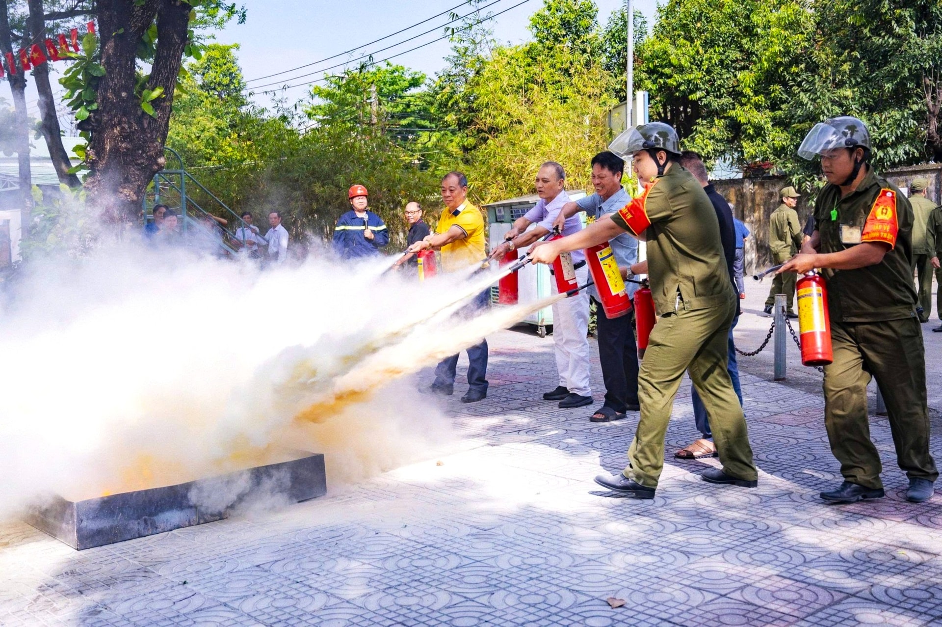 Lực lượng an ninh cơ sở tập huấn kỹ năng sử dụng bình chữa cháy xách tay tại khu vực bỏ phiếu. Ảnh: X.Đ