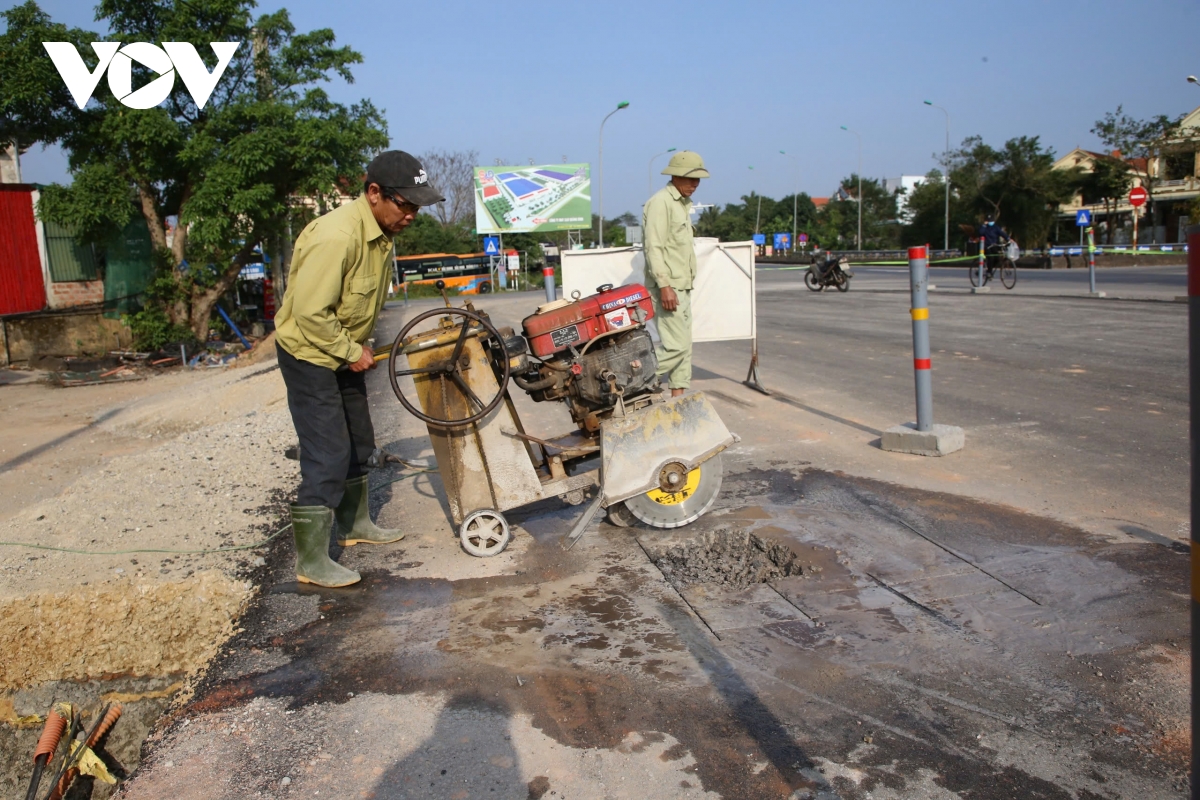 Công nhân thi công hoàn thiện các hạng mục cuối cùng ở đường dẫn cầu Quán Hàu. Giao thông khu vực được tổ chức phân luồng trong thời gian thi công.