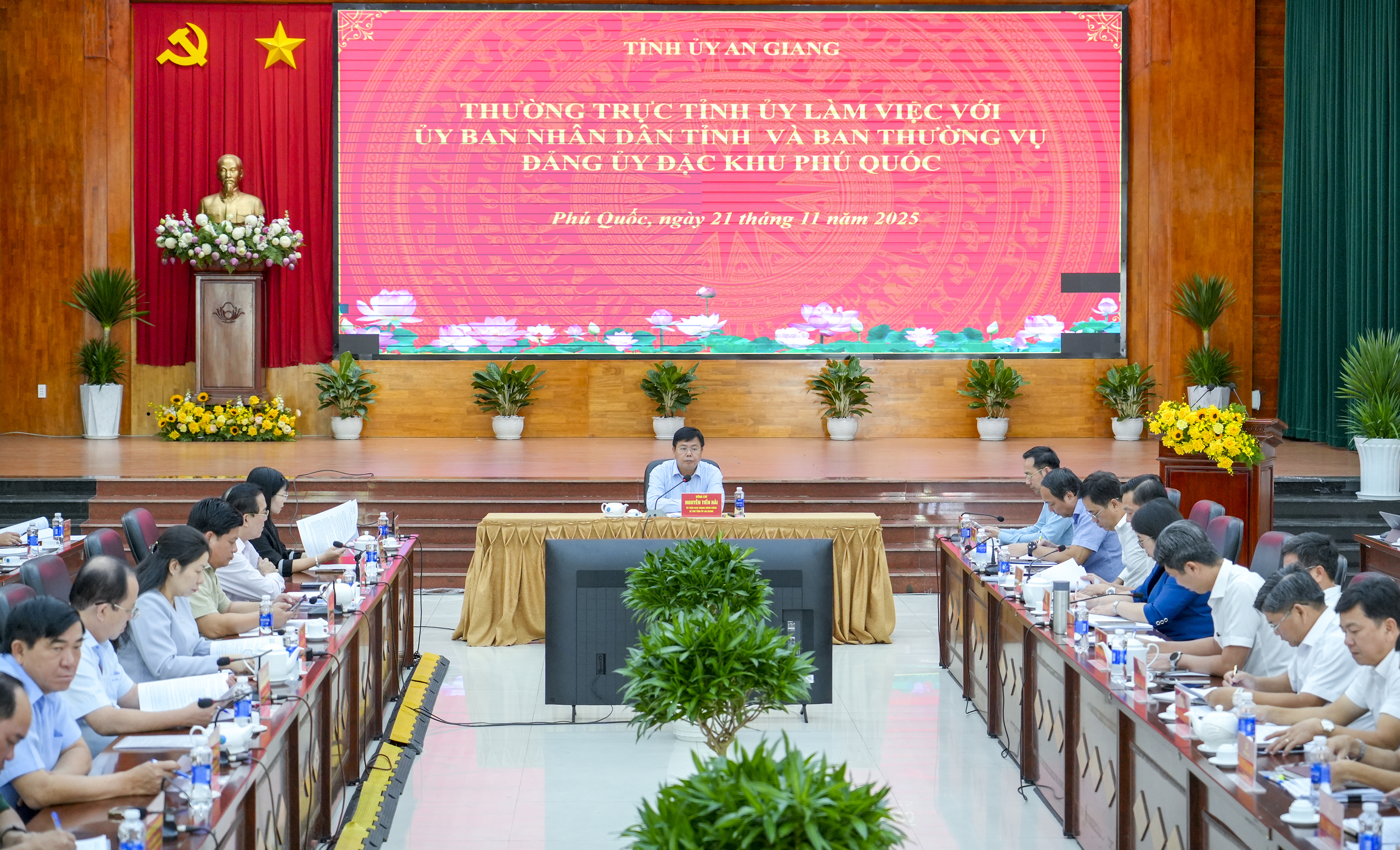 Sáng 21-11, tại đặc khu Phú Quốc, Thường trực Tỉnh ủy An Giang tổ chức cuộc họp để nghe UBND tỉnh và Ban Thường vụ Đảng ủy đặc khu Phú Quốc báo cáo công tác chuẩn bị các điều kiện phục vụ Hội nghị APEC 2027.