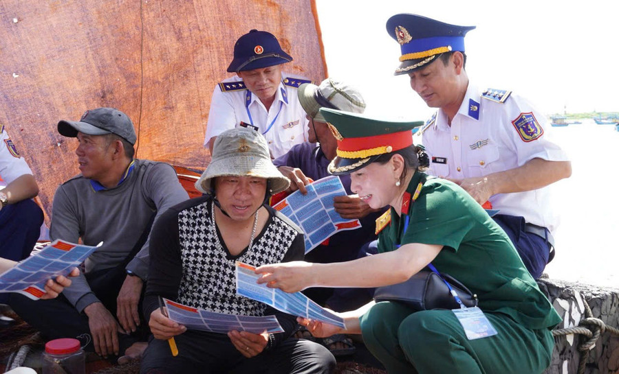 Bộ Tư lệnh Vùng Cảnh sát biển 2 và đoàn công tác các địa phương tuyên truyền chống khai thác IUU trên tàu các ngư dân tại Đặc khu Lý Sơn (Quảng Ngãi). Ảnh: Minh Trung