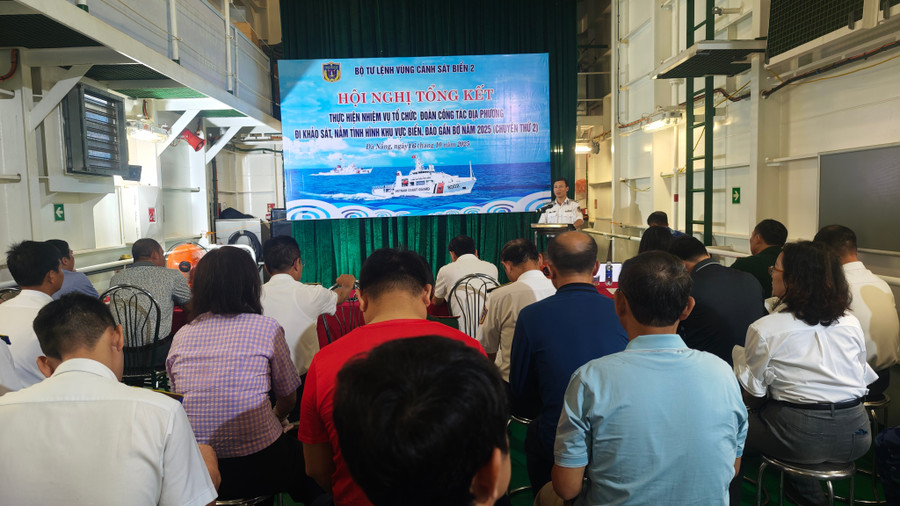 Bộ Tư lệnh Vùng Cảnh sát biển 2 và Đoàn công tác các địa phương họp tổng kết rút kinh nghiệm chuyến khảo sát. Ảnh: Minh Trung