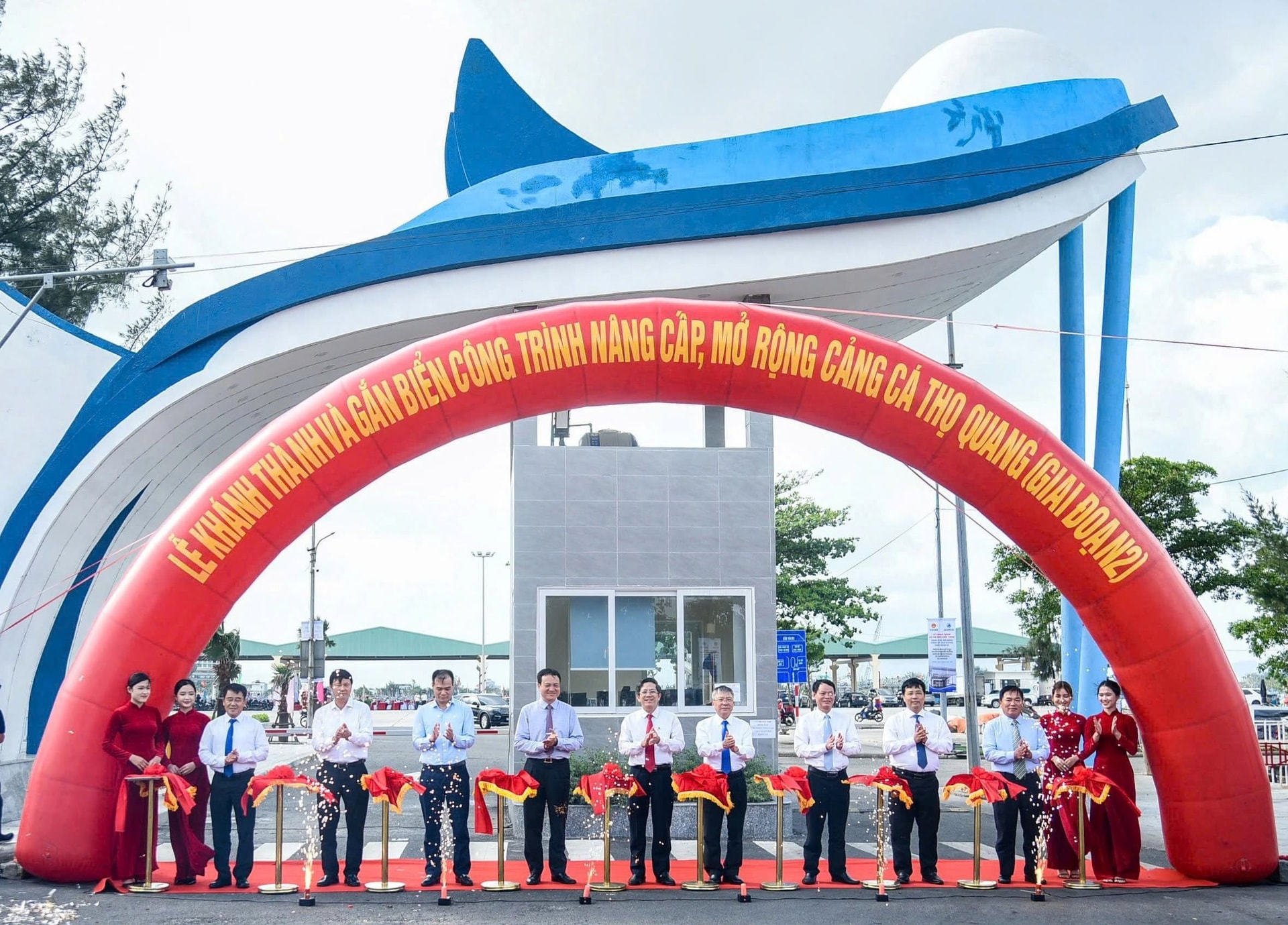 Lãnh đạo thành phố thực hiện nghi thức cắt băng khánh thành công trình Nâng cấp, mở rộng Cảng cá Thọ Quang (giai đoạn 2).