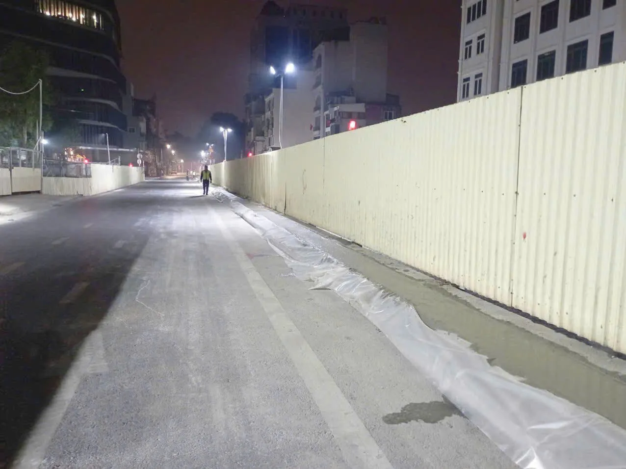 Tại ga S10 Cát Linh, nơi đang thi công đồng thời phần kiến trúc ngầm và các hạng mục phụ trợ, mặt đường xe chạy đã được mở rộng thêm, kết hợp hoàn thiện lối đi bộ tạm dọc hàng rào, bảo đảm an toàn cho người dân trong khu vực.