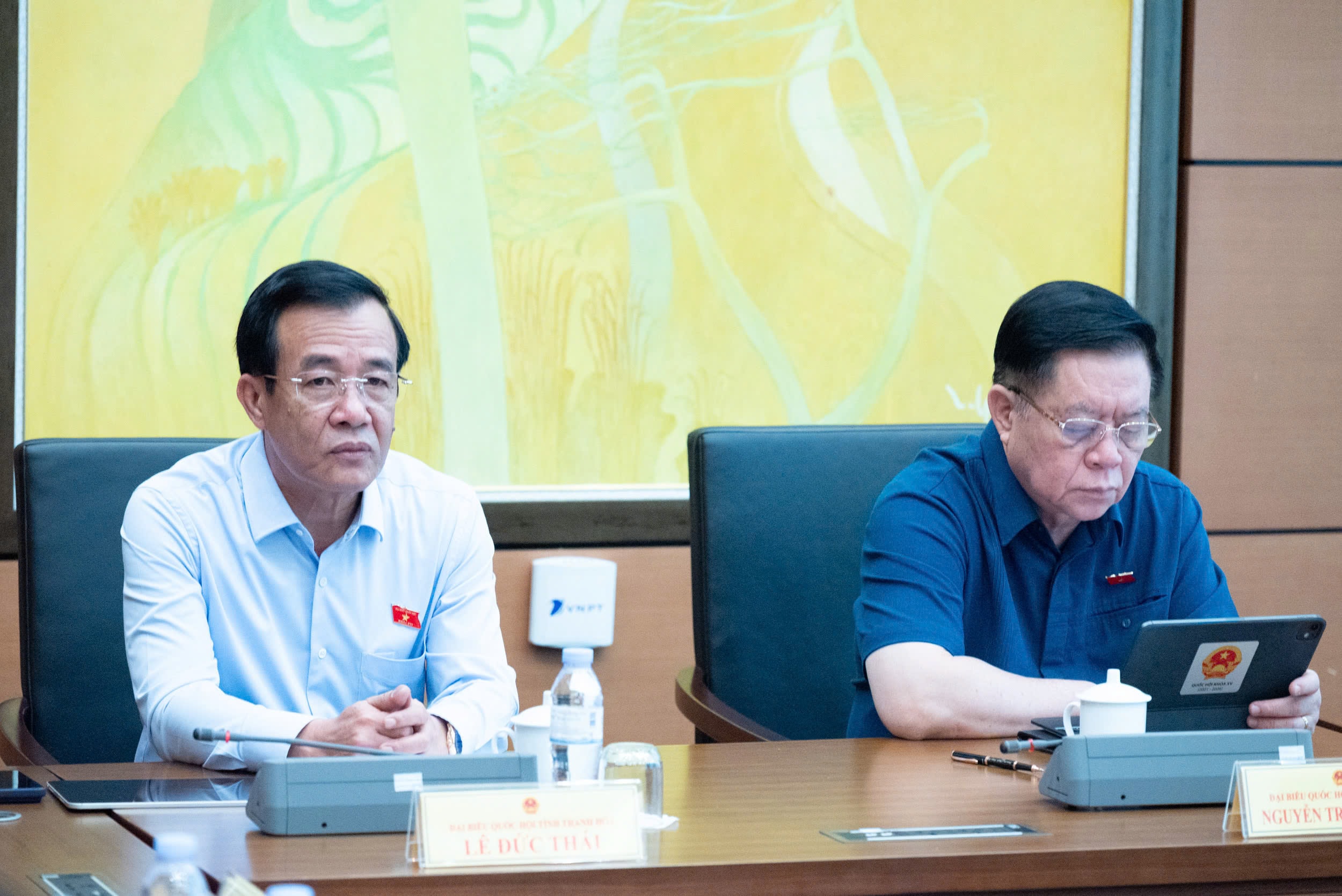 Ủy viên Bộ Chính trị, Bí thư Trung ương Đảng, Chủ nhiệm Tổng cục Chính trị QĐND Việt Nam, Đại tướng Nguyễn Trọng Nghĩa và Ủy viên Trung ương Đảng, Bí thư Tỉnh ủy, Trưởng đoàn ĐBQH tỉnh Thanh Hóa Lê Đức Thái tại buổi thảo luận tổ. Ảnh: Phạm Thắng