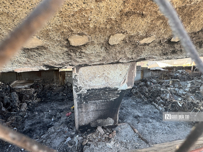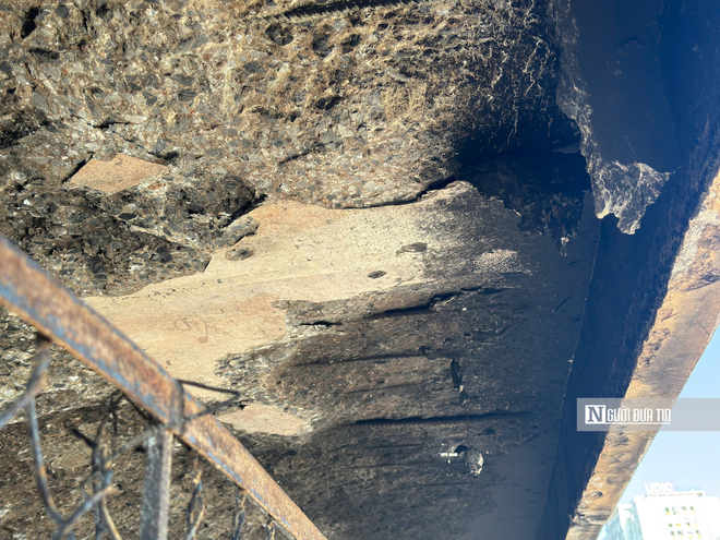 Tại vị trí trụ đỡ T2 của công trình sau khi trải qua vụ hỏa hoạn đã khiến bê tông của trụ này rơi ra từng mảng nham nhở. Phía dưới là số lượng lớn các phương tiện bị ngọn lửa thiêu rụi.
