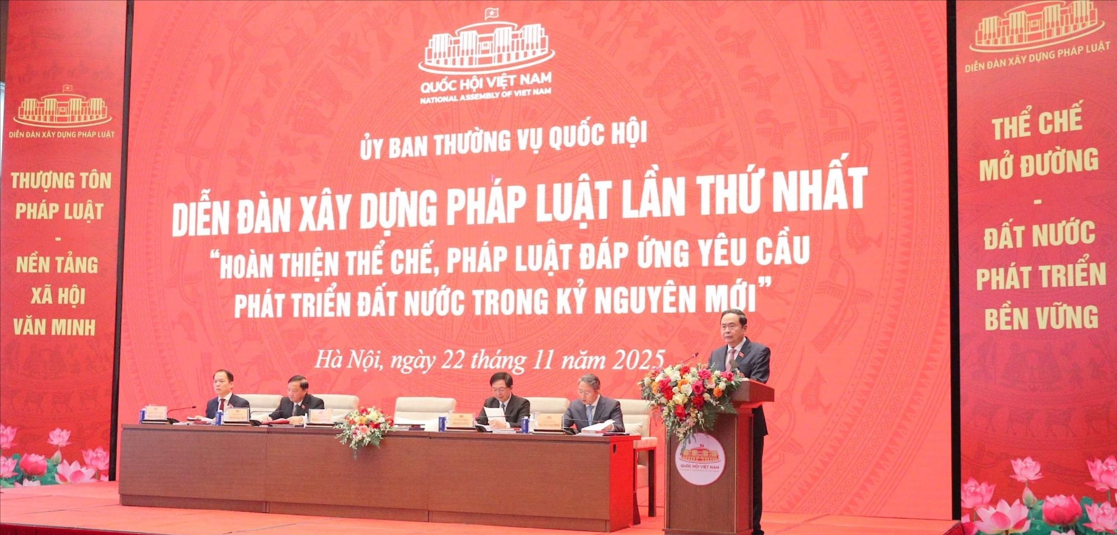 Phát biểu khai mạc diễn đàn, Chủ tịch Quốc hội Trần Thanh Mẫn nêu rõ, lần đầu tiên, Diễn đàn Xây dựng pháp luật được tổ chức cùng với việc tổng kết công tác nhiệm kỳ của Quốc hội khóa XV. Đây chính là dịp để đánh giá khách quan, toàn diện công tác lập pháp của Quốc hội, từ đó đề xuất các giải pháp nhằm tiếp tục hoàn thiện thể chế, pháp luật đáp ứng yêu cầu phát triển đất nước trong giai đoạn mới.