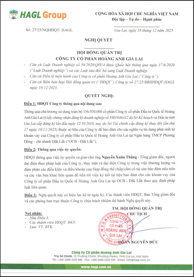 Theo thông tin được công bố, HAGL đã thông qua chủ trương sửdụng toàn bộ 156,93 triệu cổ phần đang sở hữu tại CTCP Đầu tư Quốc tế Hoàng AnhGia Lai (HAGL Investment) để bảo đảm cho các nghĩa vụ tín dụng phát sinh từ khoảnvay của doanh nghiệp này tại Ngân hàng TMCP Phương Đông (OCB) - Chi nhánh Đắk Lắk.