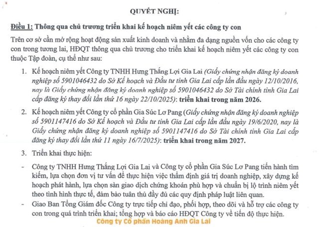Theo đó, HAGL sẽ triển khai kế hoạch niêm yết Công ty TNHH Thắng Lợi Gia Lai trong năm 2026 và Công ty cổ phần Gia Súc Lơ Pang trong năm 2027.