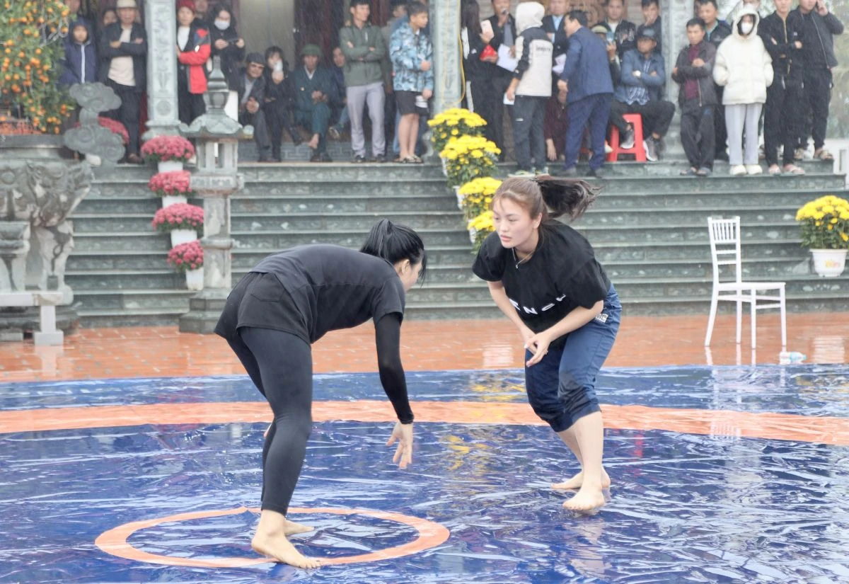 Mặc dù trời mưa, song đông đảo người dân tập trung quanh sới vật, chăm chú theo dõi, cổ vũ, tạo nên không khí lễ hội sôi nổi trong những ngày đầu xuân năm mới.