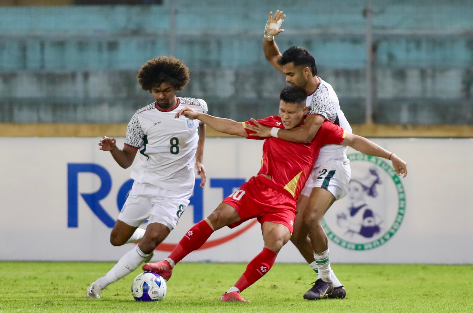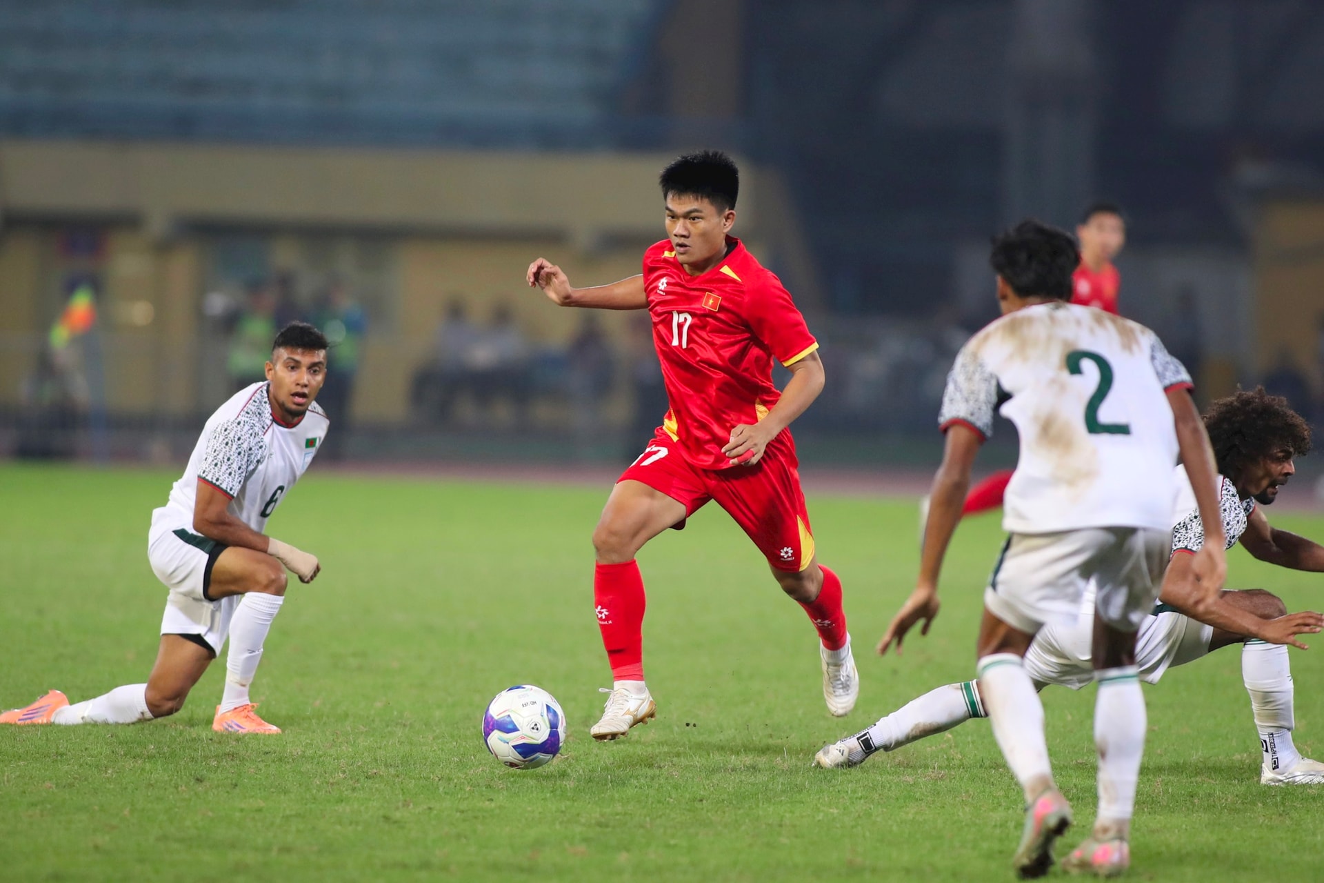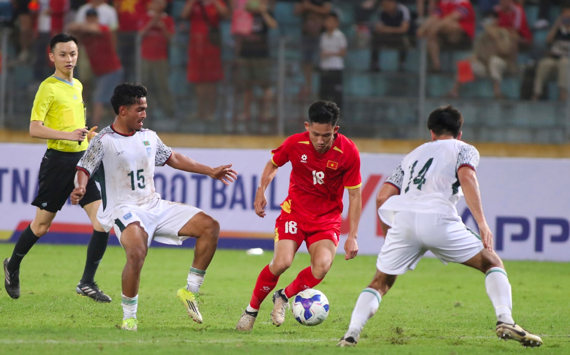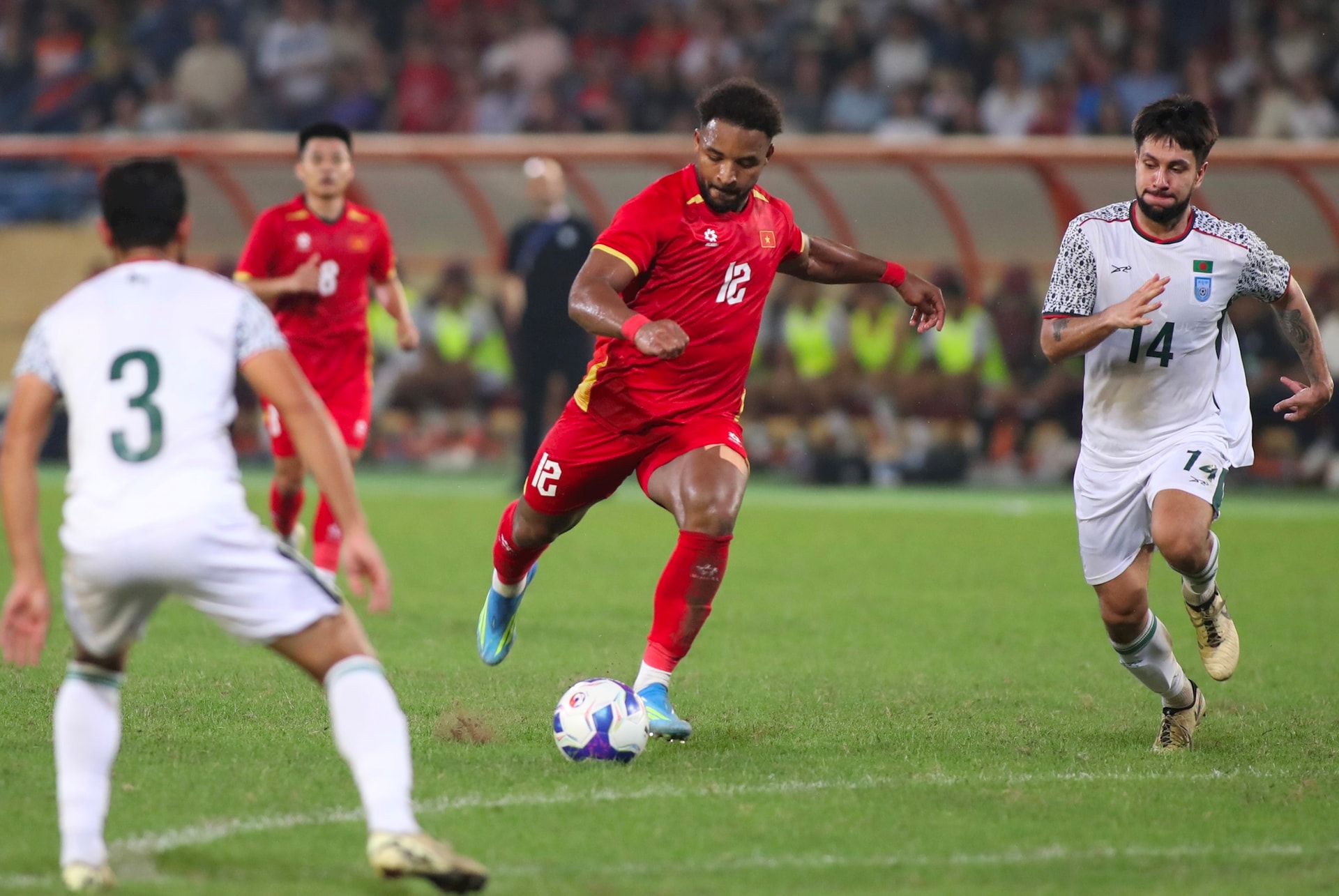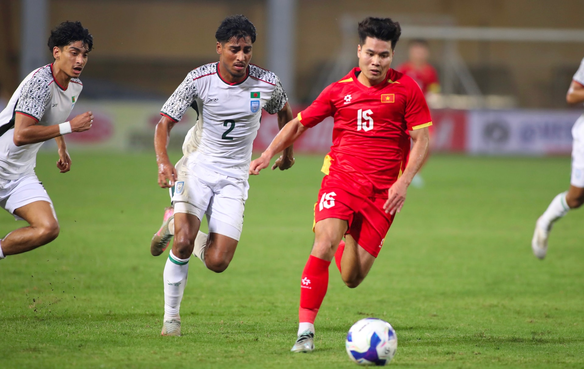 Trước đối thủ yếu hơn và có lợi thế dẫn trước, tuyển Việt Nam thi đấu lấn lướt và nắm chủ động trước tuyển Bangladesh. Ảnh: Ngọc Tú