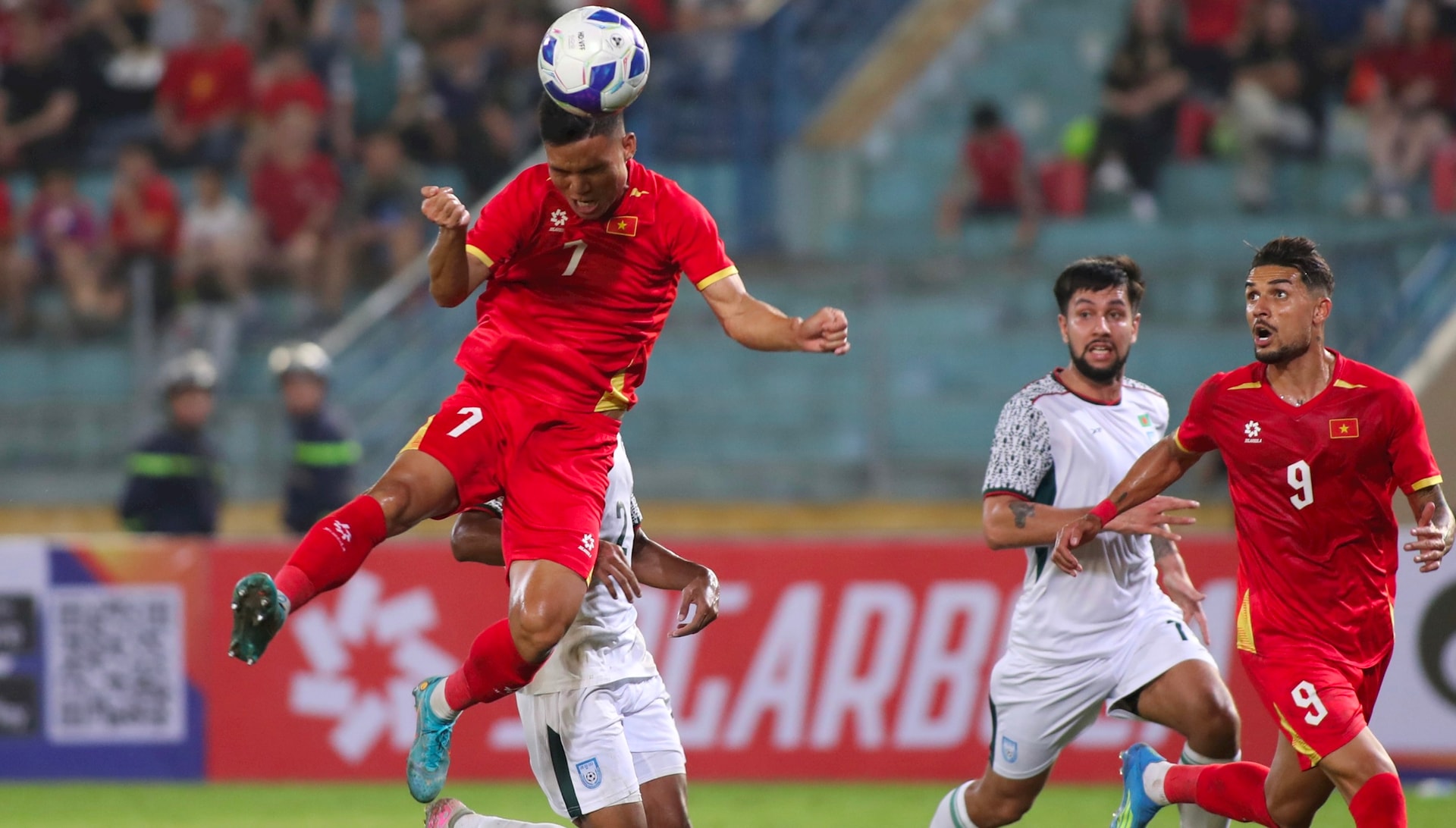Quang Hải treo bóng vào vòng cấm từ tình huống đá phạt bên cánh phải, Xuân Mạnh bật cao đánh đầu nhân đôi cách biệt cho tuyển Việt Nam. Ảnh: Ngọc Tú