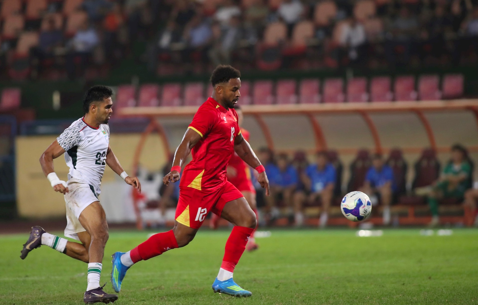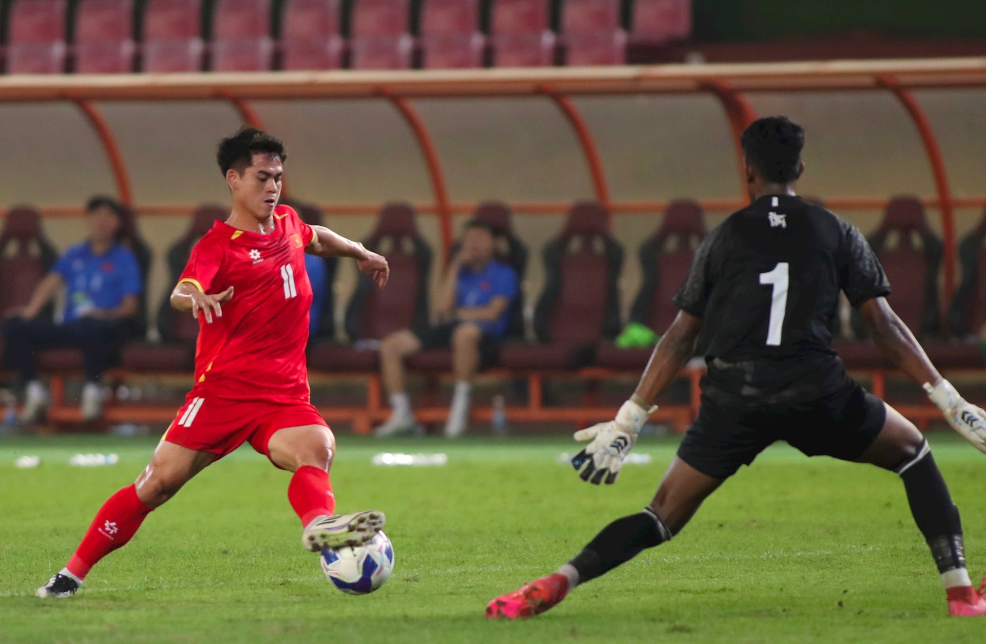 Văn Khang cũng là cầu thủ bỏ lỡ cơ hội đáng tiếc khi đối mặt với thủ môn đối phương. Khép lại trận đấu, tuyển Việt Nam có chiến thắng 3-0 trước tuyển Bangladesh. Ảnh: Ngọc Tú