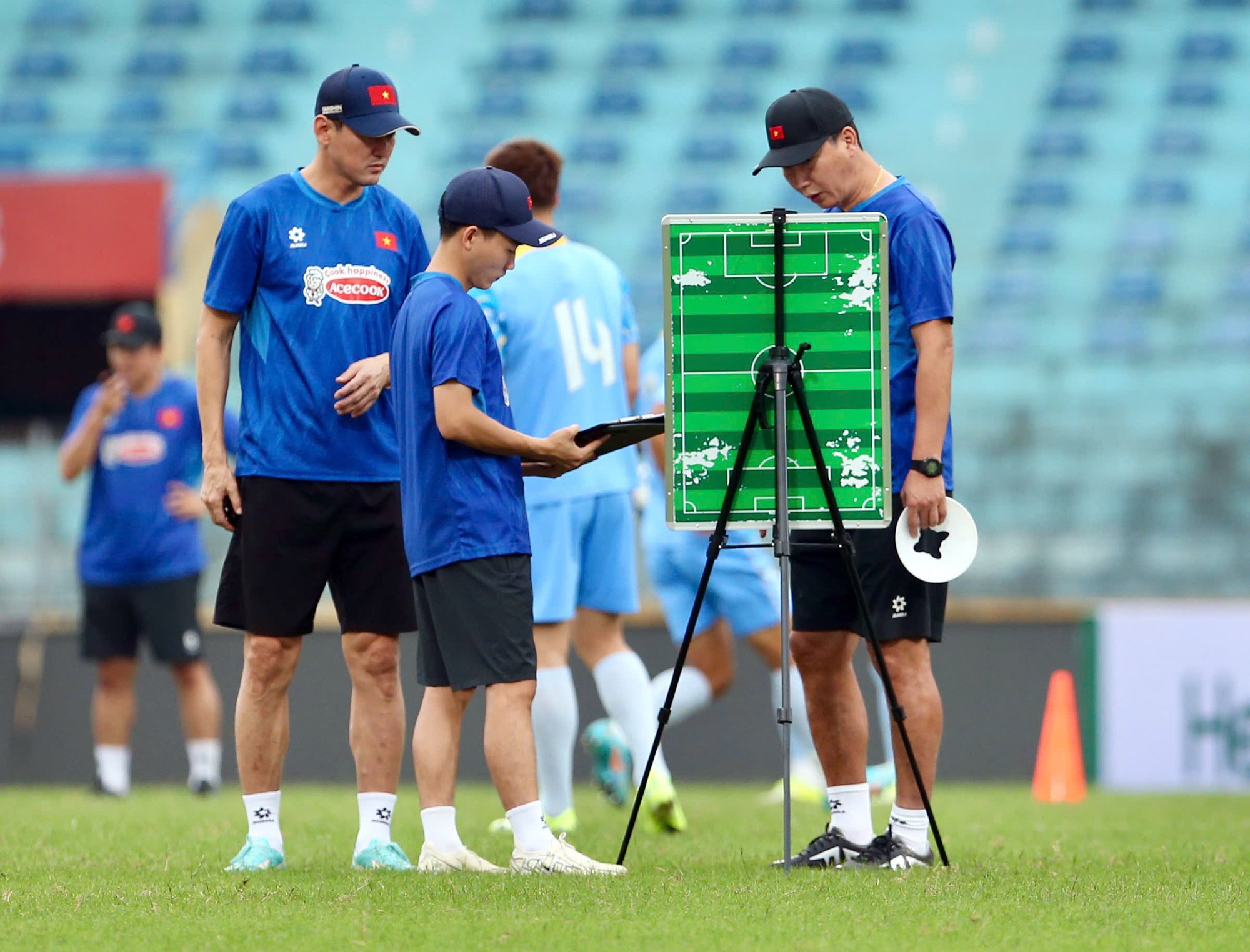 HLV Kim Sang Sik bàn chiến thuật cùng các trợ lý.