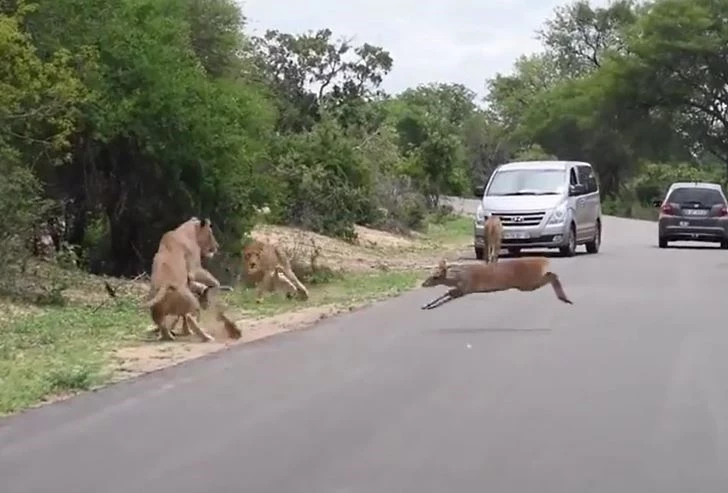 Theo Hannes Beeslar, một giáo viên đến từ Nelspruit (Nam Phi) - người đã ghi lại toàn bộ diễn biến - vụ việc xảy ra khi con hươu bị truy đuổi và tìm cách thoát thân. Trong cơn hoảng sợ, nó liều lĩnh nhảy qua nhóm sư tử đang chắn ngang con đường, nhưng cú nhảy định mệnh ấy lại khiến con vật rơi thẳng vào nanh vuốt của kẻ săn mồi.