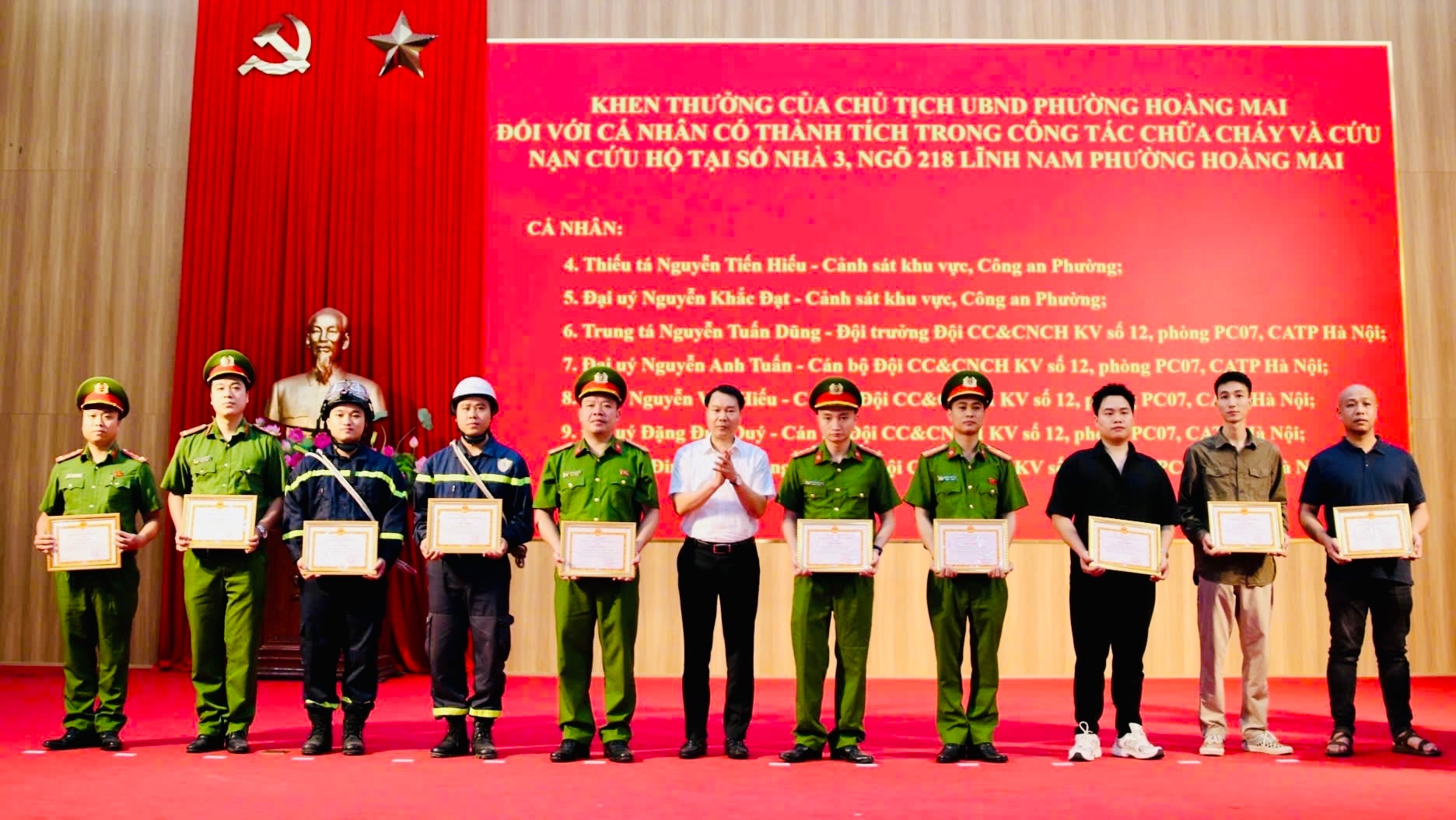 Chủ tịch UBND phường Nguyễn Lê Hiến khen thưởng 10 cá nhân có thành tích trong công tác chữa cháy và cứu nạn cứu hộ tại số nhà 3, ngõ 218 Lĩnh Nam. Ảnh: HM.