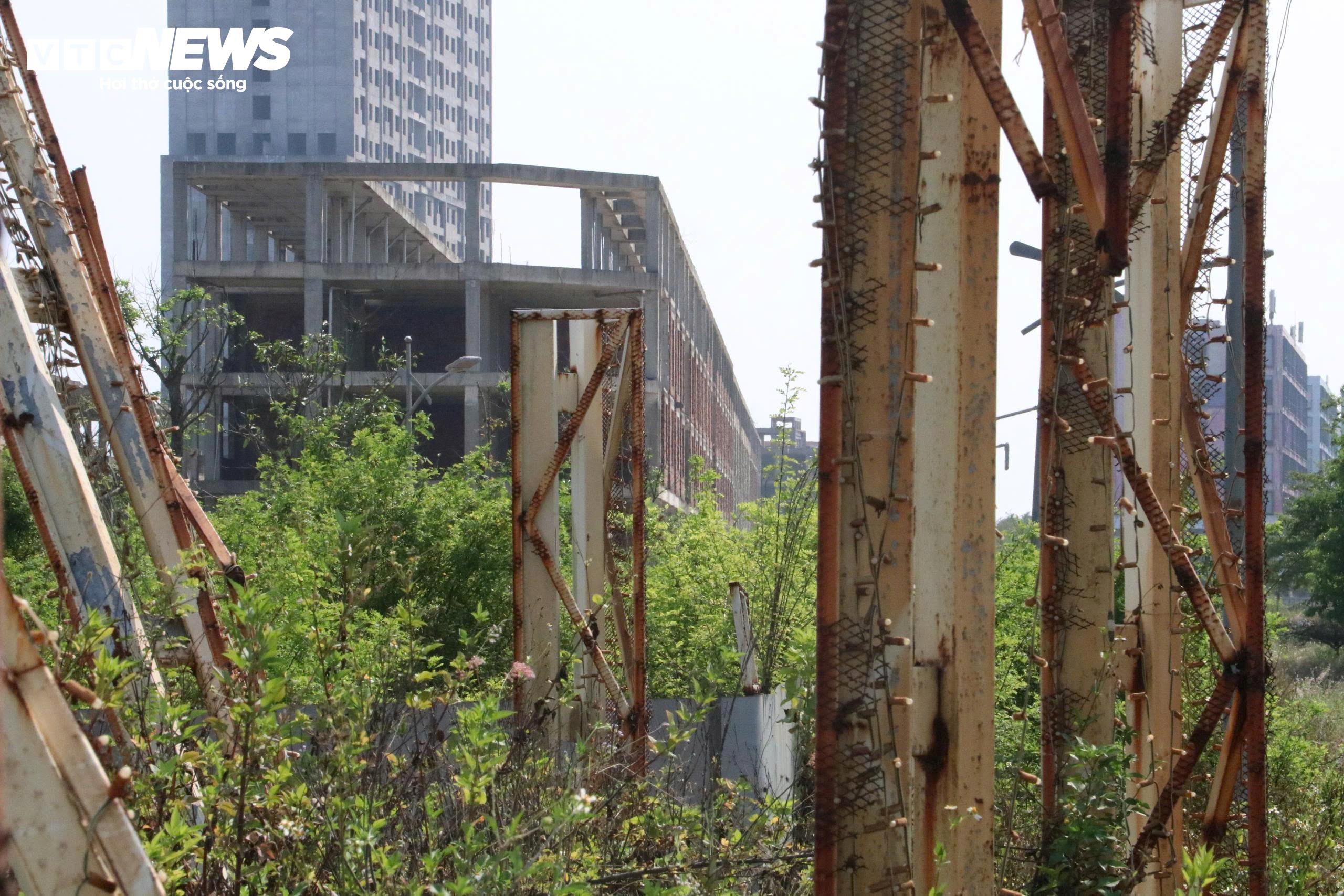 Bên trong khu đất "mọc" lên dự án, cỏ dại mọc um tùm, nhiều khối sắt bộc lộ hoen gỉ sau thời gian dài dầm mưa dãi nắng.