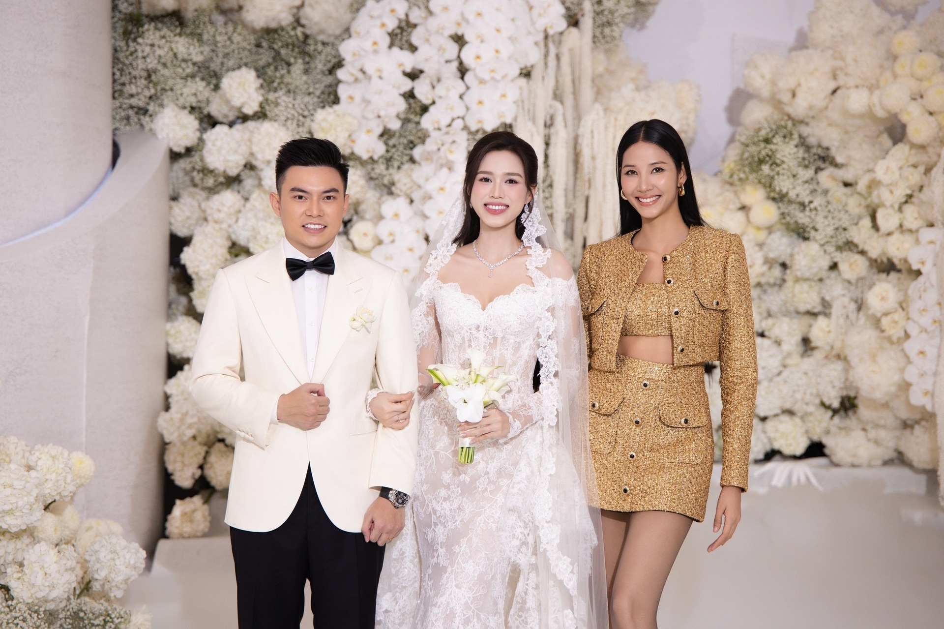 Sau khi bộ đôi tiến hành các nghi thức và trao nhau lời thề nguyện, màn tung hoa cưới từ cô dâu Đỗ Thị Hà khiến dàn khách mời phấn khích. Các hoa hậu, á hậu như Lương Thùy Linh, Đoàn Thiên Ân, Ngọc Thảo, Khánh Linh, người mẫu Hoàng Thùy nhanh chóng xếp hàng dài phía sau.