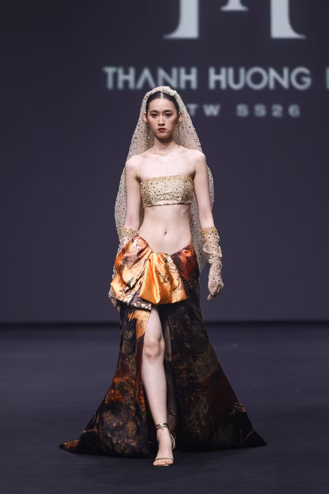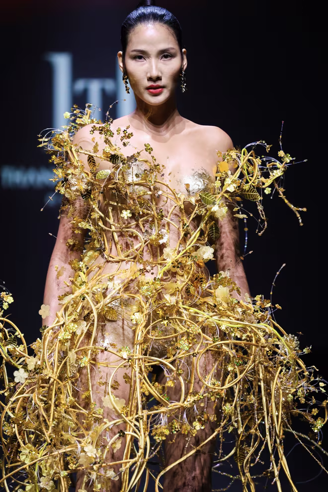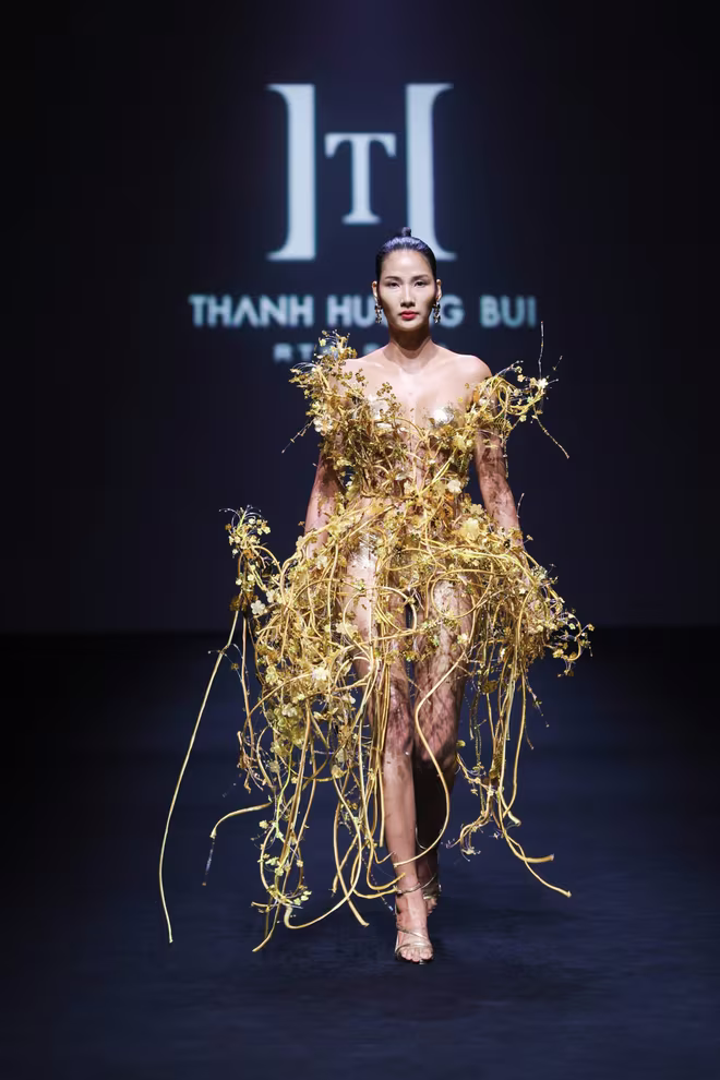 Lấy ý tưởng từ nghệ thuật chúc chỉ kết hợp nghệ thuật làm giấy truyền thống, cùng với cách dựng phom 3D, đính hoa nổi bằng cườm và dát vàng tỉ mỉ, khiến bộ trang phục mang đậm hồn Việt mà vẫn sang trọng, tinh tế