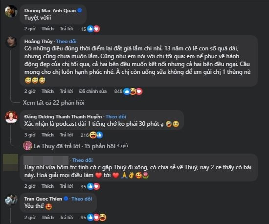 Ngoài ra, Hoàng Thùy cũng để lại bình luận trong bài viết của Lê Thúy rằng: "Có những điều đúng thời điểm lại đắt giá lắm chị nhỉ. 13 năm có lẽ con số quá dài, nhưng cũng chưa muộn lắm. Cũng như em nói với chị tối qua: em nể phục về hành động đẹp của chị tối qua, cả hai bên đều muốn kết nối nhưng cả hai bên đều ngại. Cầu mong cho chị luôn hạnh phúc nhé. À chị còn uống sữa không để em gửi chị 1 thùng nè".