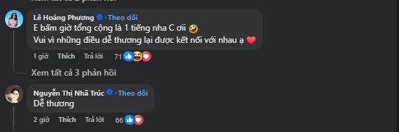 Dưới phần bình luận, nhiều đồng nghiệp đã vào bình luận chúc mừng cho Lê Thúy và Hoàng Thùy, thích thú vì màn tái hợp dễ thương này. Thậm chí, MC Thanh Thanh Huyền và Lê Hoàng Phương còn đùa rằng thực chất cuộc nói chuyện này kéo dài 1 tiếng chứ không phải 30 phút.