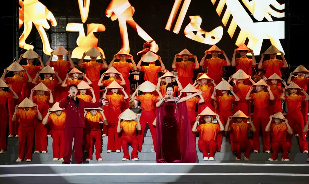 Ca sĩ Võ Hạ Trâm và Hoàng Hải thể hiện liên khúc Tự hào Việt Nam - Vinh quang đang chờ ta. Ảnh: THUẬN VĂN