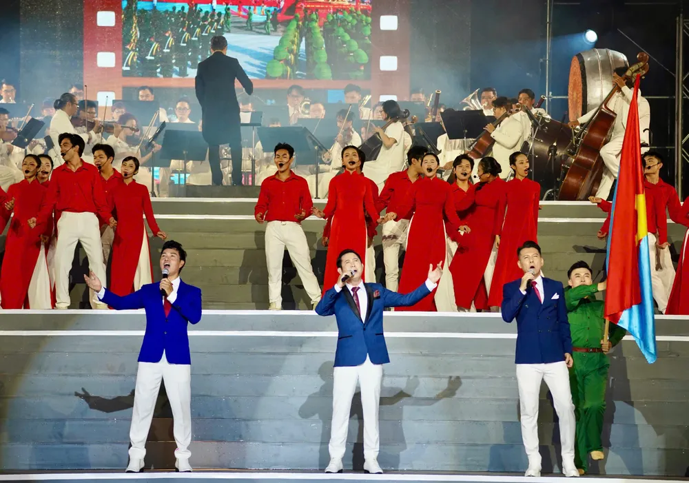 Anh Bằng, Phạm Trang, Thành Tâm thể hiện Liên khúc Mười chín tháng Tám - Khúc khải hoàn - Tiến về Sài Gòn - Việt Nam ngày đại thắng. Ảnh: THUẬN VĂN