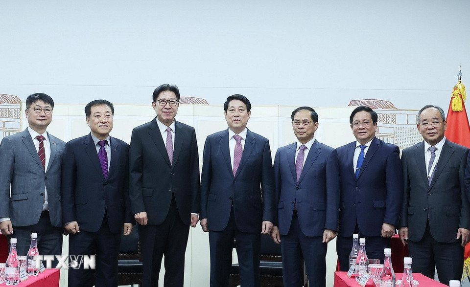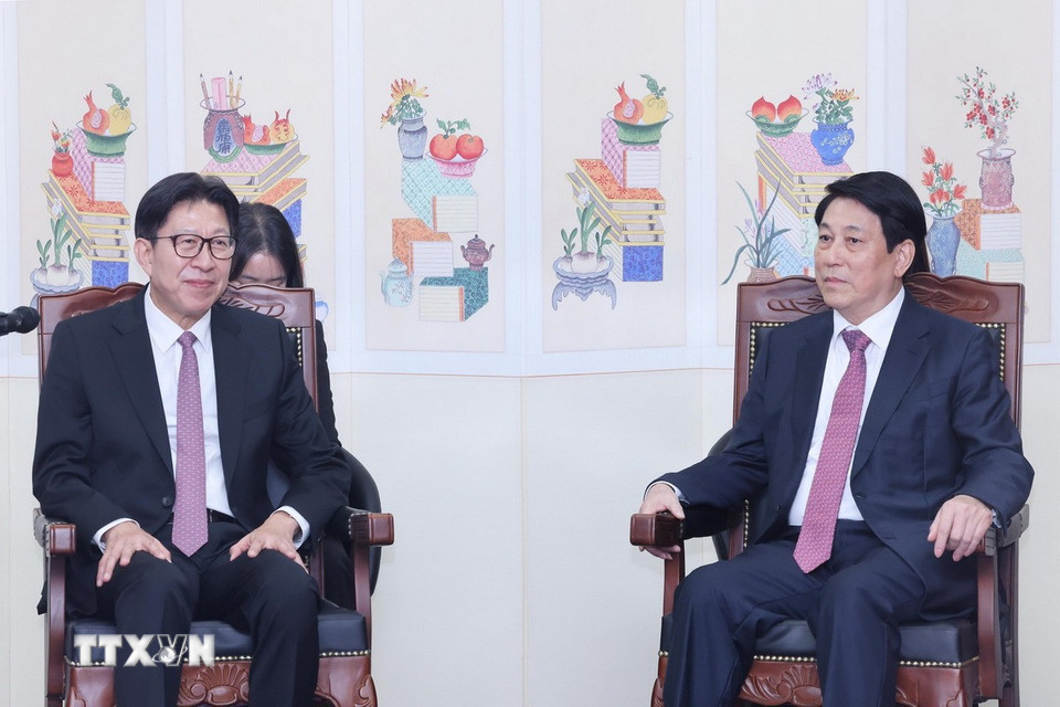 Chủ tịch nước Lương Cường tiếp Thị trưởng thành phố Busan Park Heong-joon. (Ảnh: Lâm Khánh/TTXVN)