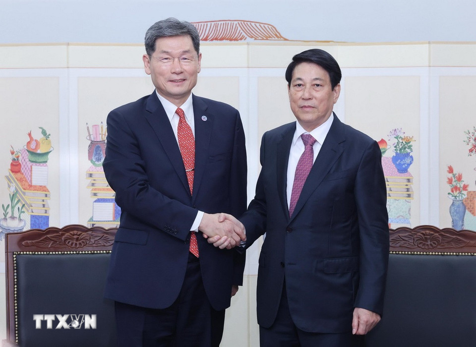 Chủ tịch nước Lương Cường tiếp Chủ tịch Quỹ giao lưu quốc tế Hàn Quốc (KF) Kim Ghee Whan. (Ảnh: Lâm Khánh/TTXVN)
