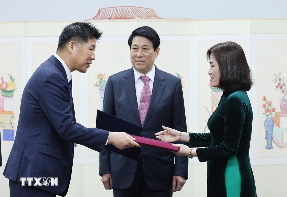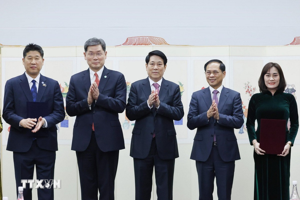 Chủ tịch nước Lương Cường chứng kiến lễ trao văn kiện hợp tác giữa Quỹ Giao lưu quốc tế Hàn Quốc và Bảo tàng Dân tộc học Việt Nam. (Ảnh: Lâm Khánh/TTXVN)