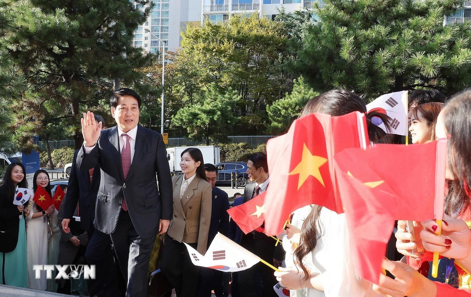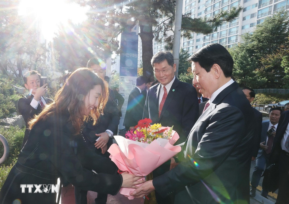 Lãnh đạo Trung tâm Văn hóa ASEAN tại Busan đón Chủ tịch nước Lương Cường. (Ảnh: Lâm Khánh/TTXVN)