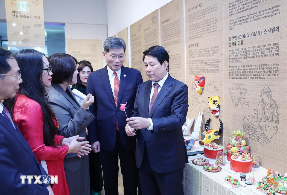 Chủ tịch nước Lương Cường tham quan không gian trưng bày văn hóa, trò chơi dân gian Việt Nam. (Ảnh: Lâm Khánh/TTXVN)