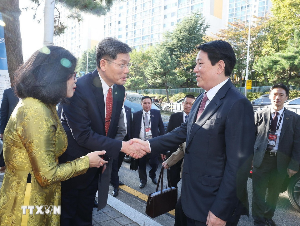 Chủ tịch nước Lương Cường với Thị trưởng thành phố Busan Park Heong-joon. (Ảnh: Lâm Khánh/TTXVN)