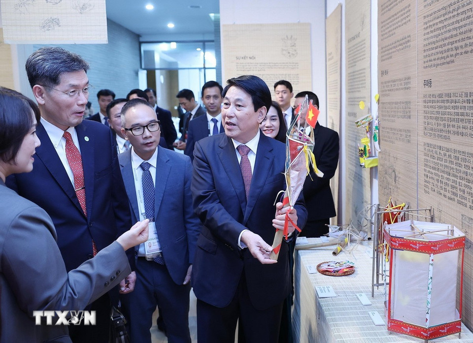 Chủ tịch nước Lương Cường thăm Trung tâm Văn hóa ASEAN tại Busan, Hàn Quốc. (Ảnh: Lâm Khánh/TTXVN)