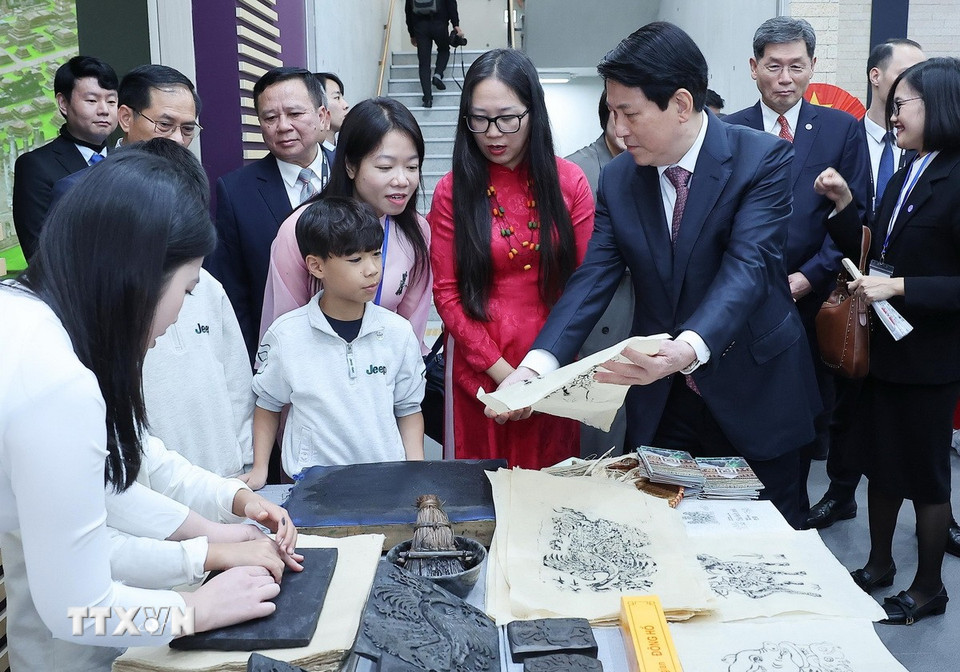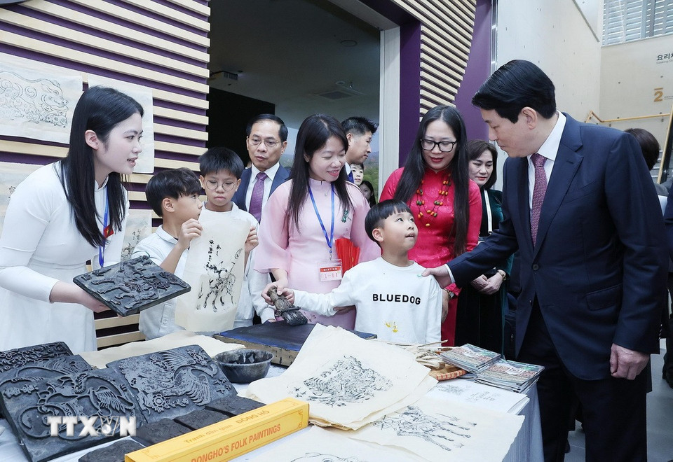 Chủ tịch nước Lương Cường thăm hỏi trẻ em người Việt Nam đang trải nghiệm làm tranh Đông Hồ tại Trung tâm Văn hóa ASEAN. (Ảnh: Lâm Khánh/TTXVN)