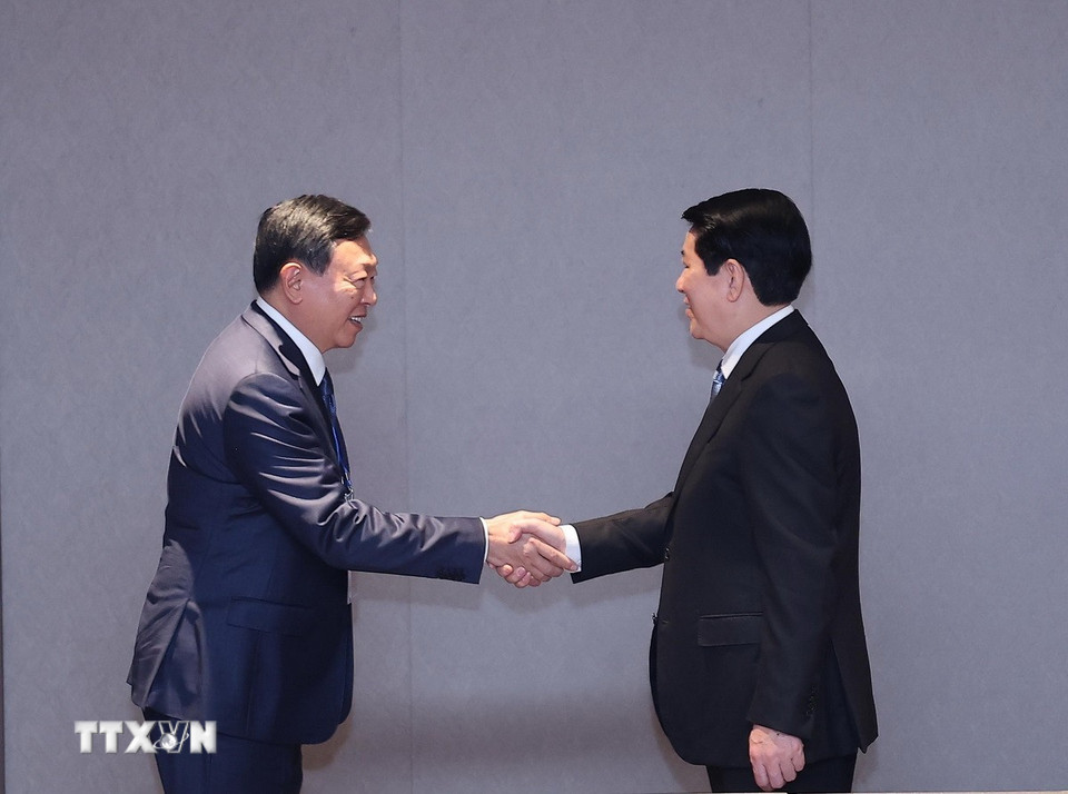 Chủ tịch nước Lương Cường tiếp Chủ tịch Tập đoàn Lotte Shin Dong-bin. (Ảnh: Lâm Khánh/TTXVN)