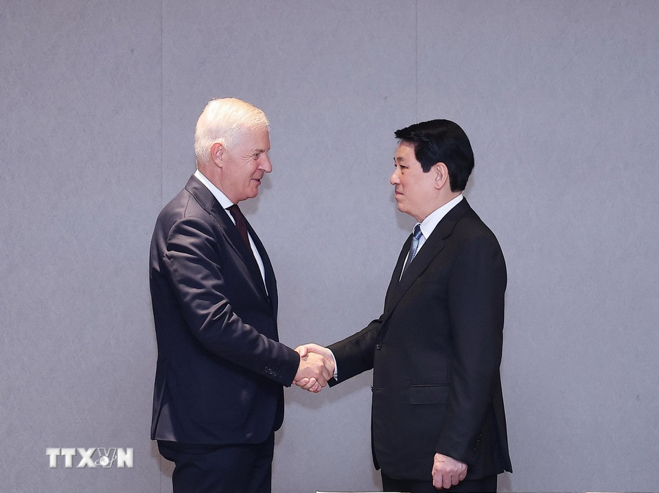 Chủ tịch nước Lương Cường tiếp Tổng Thư ký Phòng Thương mại quốc tế (ICC) John W.H. Denton AO. (Ảnh: Lâm Khánh/TTXVN)