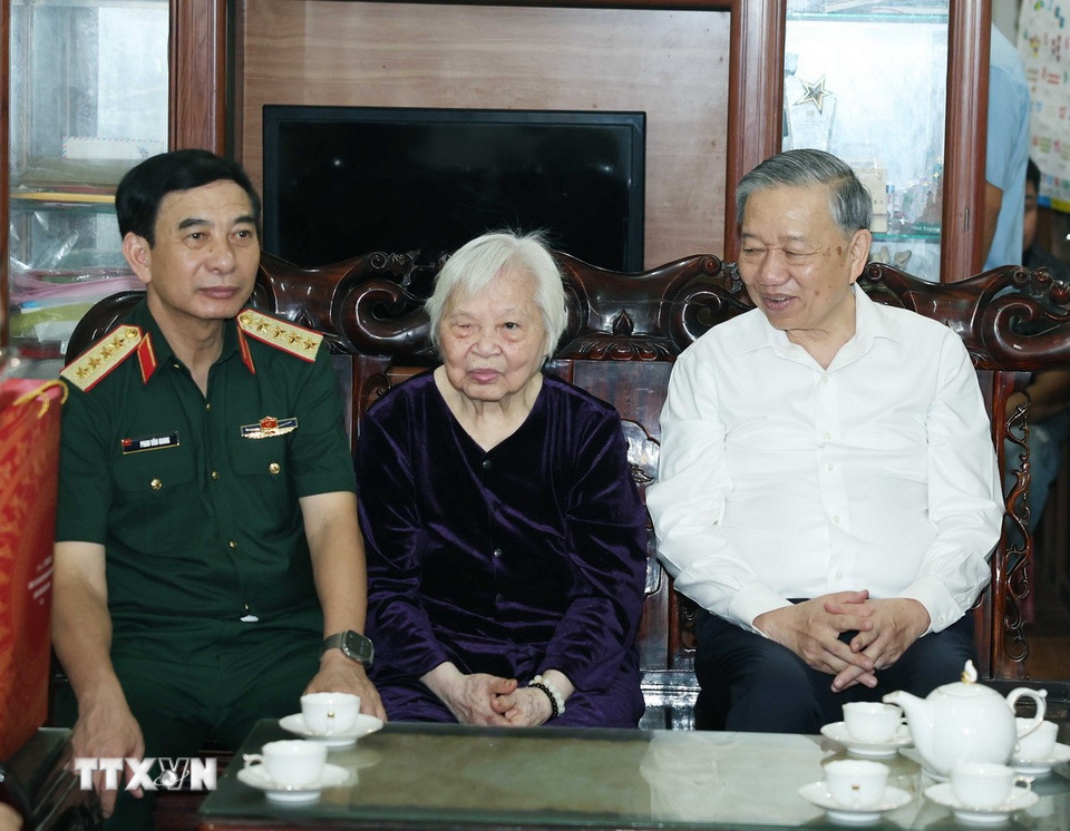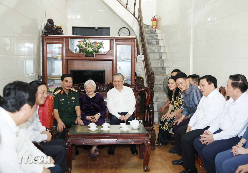 Tổng Bí thư Tô Lâm thăm Mẹ Việt Nam Anh hùng Nguyễn Thị Oanh. (Ảnh: Thống Nhất/TTXVN)
