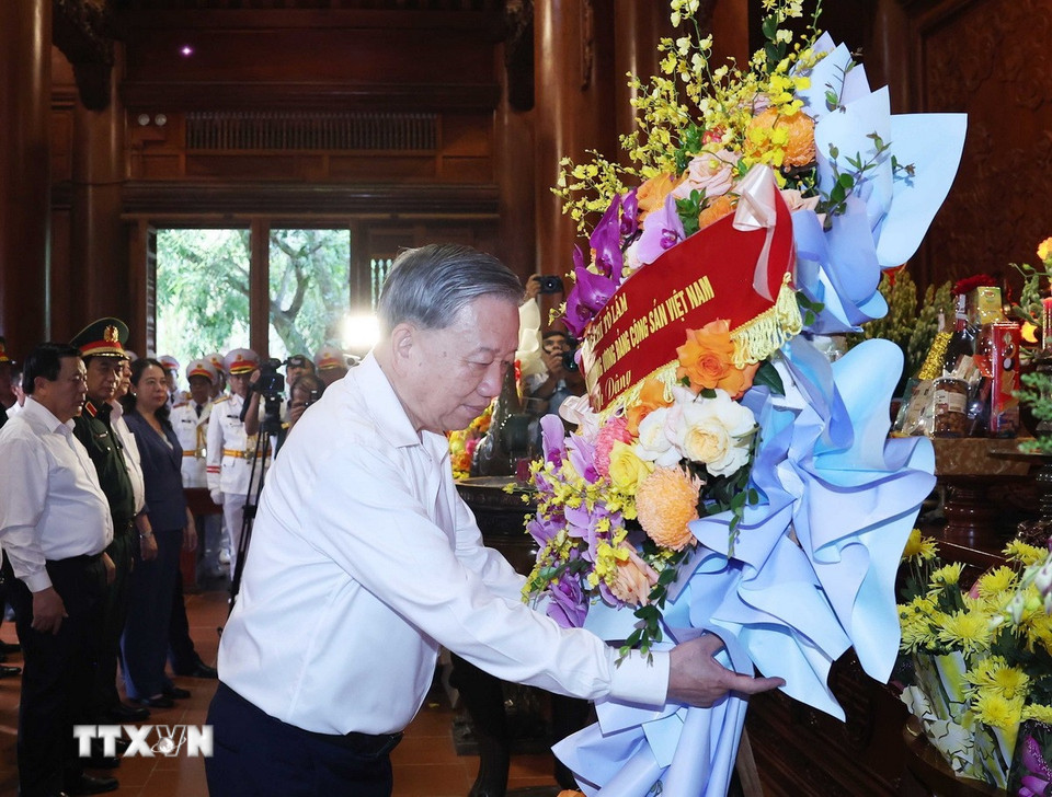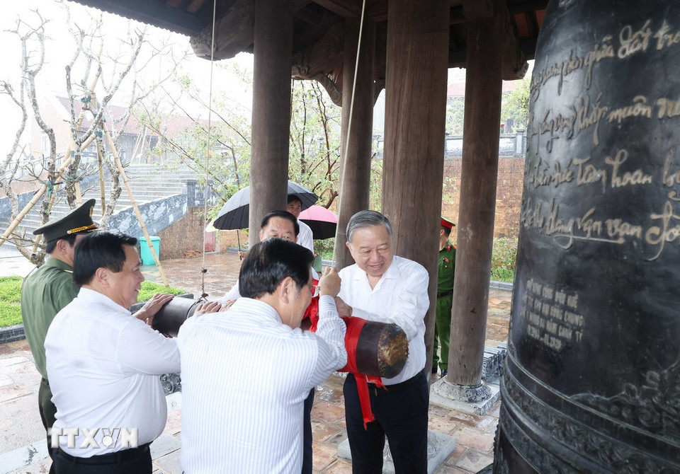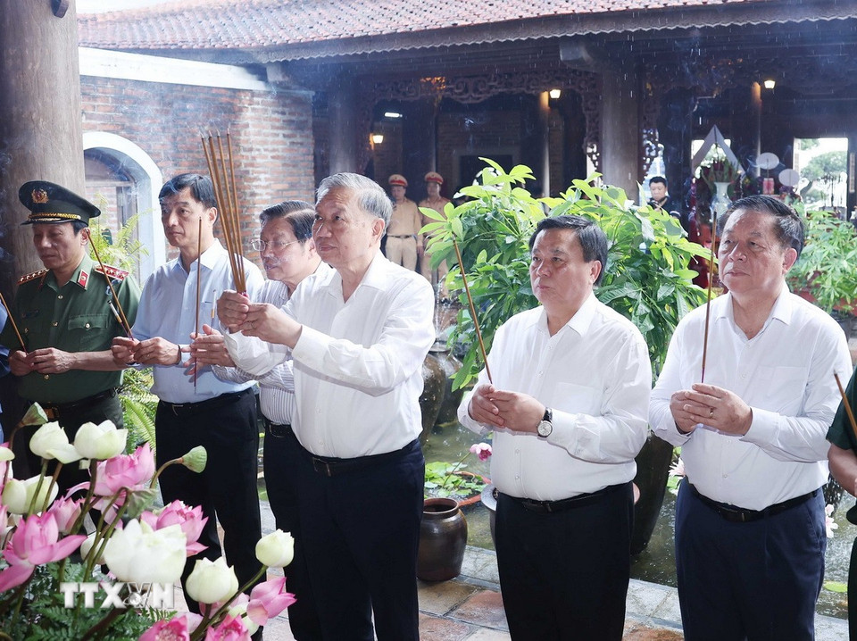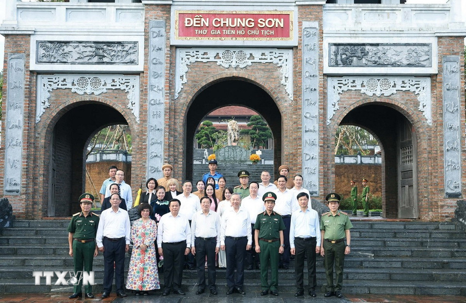 Tổng Bí thư Tô Lâm và các đại biểu tại Đền Chung Sơn. (Ảnh: Thống Nhất/TTXVN)