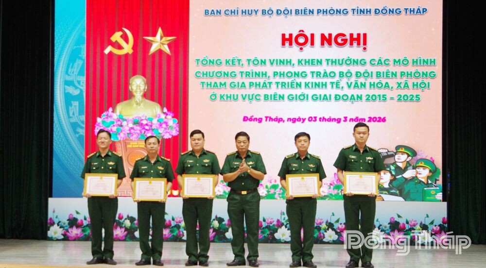 Thiếu tá Nguyễn Văn Sáu, Chính trị viên phó Đồn Biên phòng Cửa khẩu Quốc tế Dinh Bà (thứ 2 từ phải sang) nhận Bằng khen của UBND tỉnh Đồng Tháp vì có thành tích xuất sắc qua thực hiện mô hình “Tiết học biên cương”.