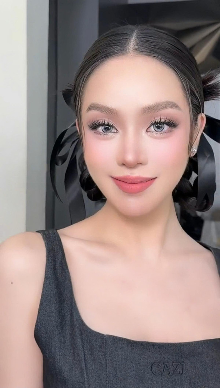Cách đây không lâu, Hoa hậu Thanh Thủy khiến cộng đồng mạng "đứng ngồi không yên" khi thử nghiệm layout trang điểm mới đầy tinh nghịch. Điểm nhấn là đôi mắt được làm nổi bật bằng kính áp tròng màu xanh biển kết hợp hàng mi cong vút, tạo ánh nhìn long lanh và trẻ trung hơn hẳn hình tượng quý phái thường thấy trên sân khấu quốc tế. Phần tóc tết hai bên buộc nơ nhỏ càng giúp tổng thể gương mặt nàng hậu trông nhí nhảnh, ngọt ngào.
