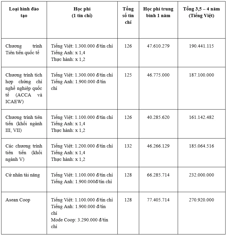 - Các chương trình tiên tiến quốc tế là những chương trình đã đạt kiểm định chất lượng bởi các tổ chức quốc tế (AUN-QA - Mạng lưới Đảm bảo chất lượng các trường đại học ASEAN), FIBAA (Bộ tiêu chuẩn kiểm định chất lượng quốc tế của châu Âu)… do đó đơn giá sẽ cao hơn. Nhóm các chương trình này thường có số tín chỉ nhiều hơn do tích hợp thêm kỹ năng mềm, kỹ năng nghề nghiệp, học phần chuyên sâu.