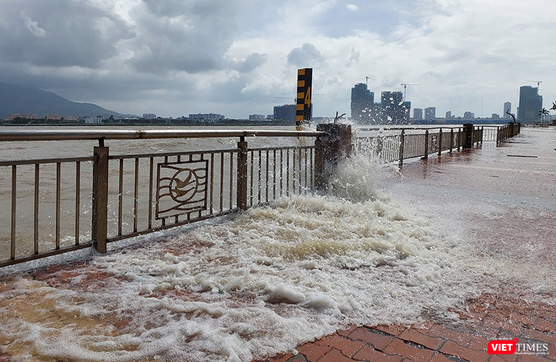 Nước sông Hàn cùng các đợt sóng tràn qua vỉa hè đường Như Nguyệt, thành phố Đà Nẵng.
