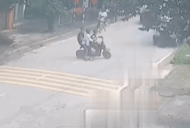 3 em học sinh chở nhau, không đội mũ bảo hiểm. Một trong 3 em này sau đó đã gặp tai nạn nguy hiểm. Ảnh cắt từ clip. (Nguồn: Tin Tổng Hợp)