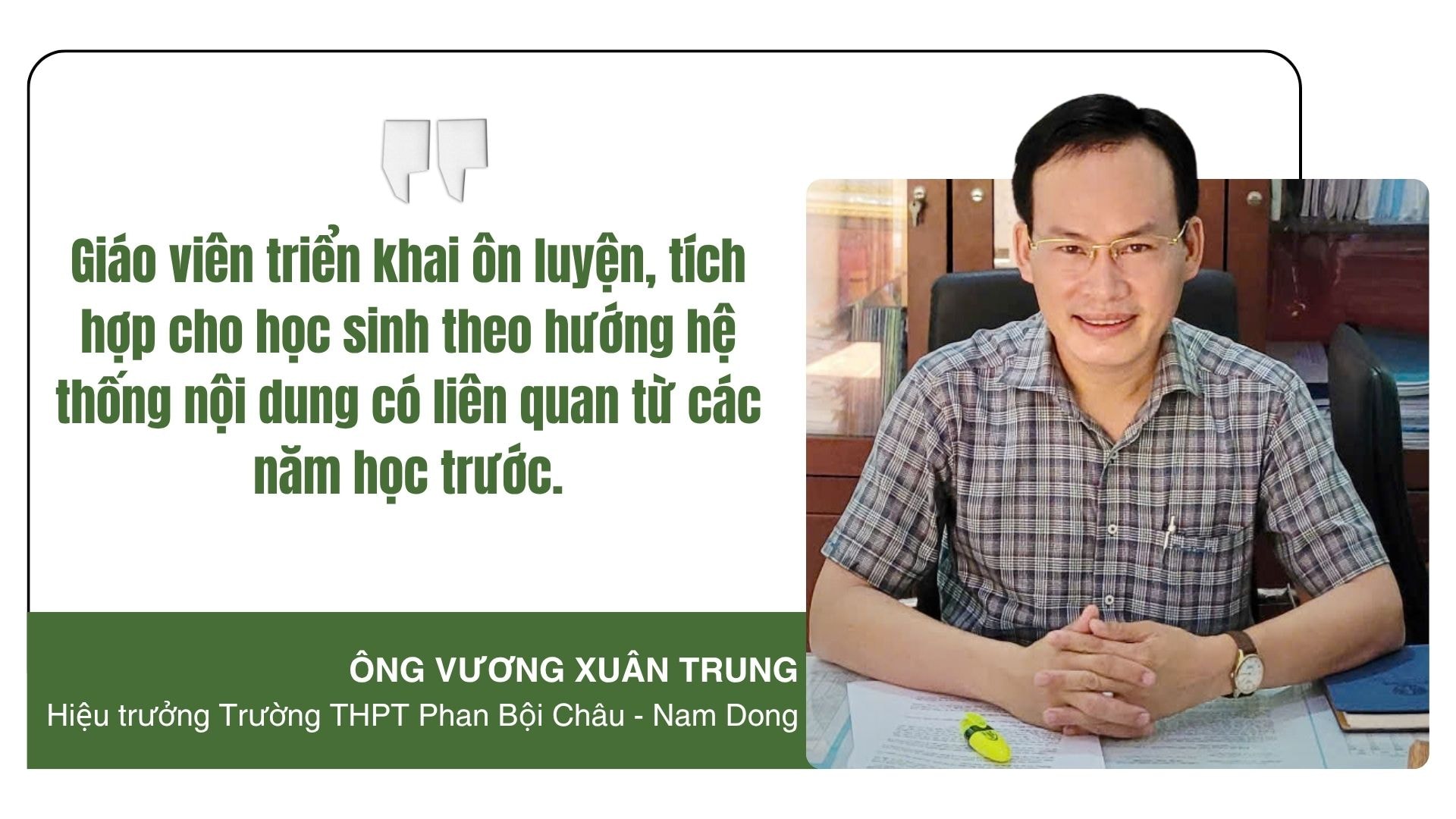 Tương tự, ông Vương Xuân Trung, Hiệu trưởng Trường THPT Phan Bội Châu - Nam Dong cho biết: Theo kỳ thi tốt nghiệp THPT yêu cầu học sinh nắm chắc kiến thức ở cả 3 khối học. Bên cạnh hoàn thành chương trình khối 12, giáo viên cũng triển khai ôn luyện, tích hợp cho học sinh theo hướng hệ thống nội dung có liên quan từ các năm học trước.