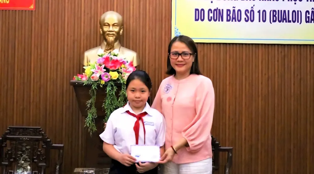 Cháu Hoàng Lê Bảo Quyên gửi tiền ủng hộ đồng bào bão lụt. Ảnh: TL