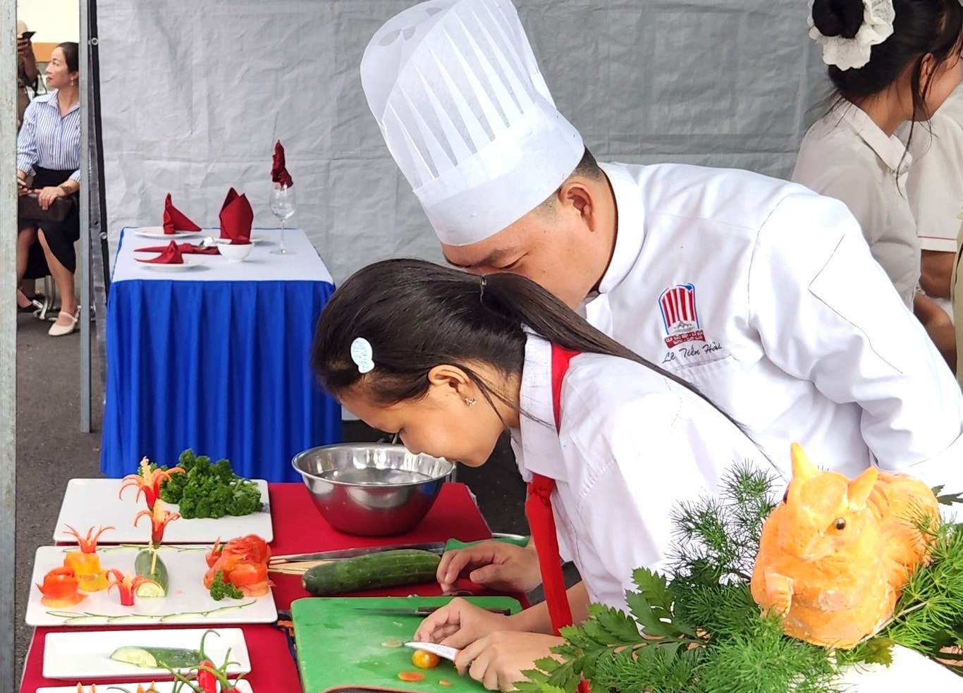 Học sinh trải nghiệm nghề làm bếp tại ngày hội. Ảnh: NGỌC HÀ