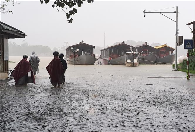 Chiều tối 26/10, mức lũ trên sông Hương, sông Bồ trên báo động 2. Một số đường ở trung tâm thành phố Huế ngập cục bộ.